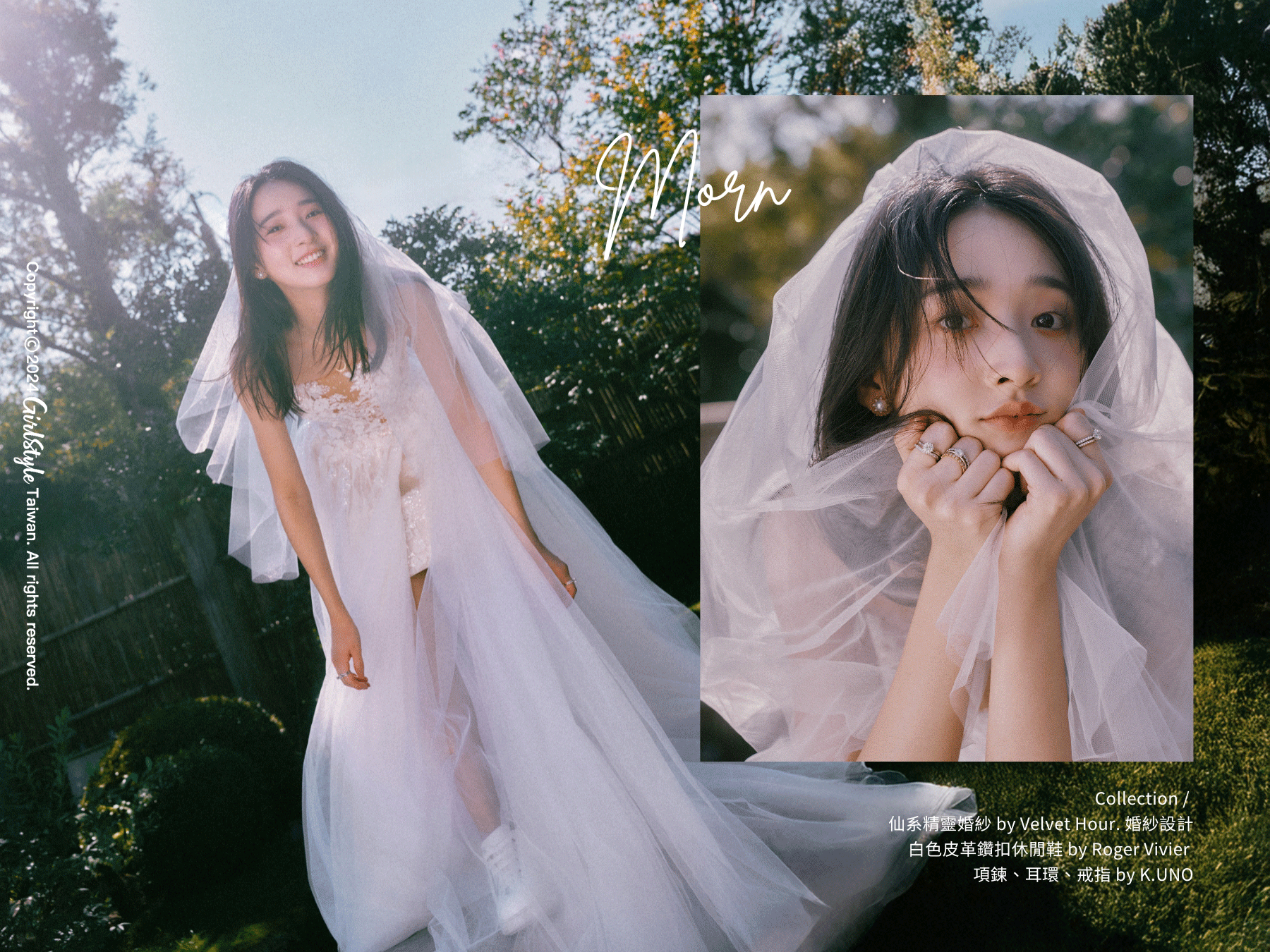 小時候曾有過服裝設計師夢想的李沐,即便後來走向了演員之路,但心中始終懷抱著小小夢想,這次拍攝剛好穿上了輕婚紗,是來自台灣品牌的「Velvet Hour.婚紗工作室」,以白紗飄逸感呈現出李沐清新脫俗的氣質,飾有不規則蕾絲和立體珠片,白色頭紗作為裝飾點綴,腳踩 Roger Vivier 白色皮革鑽扣休閒鞋,婚紗搭球鞋穿梭在樹林中,很符合李沐跳脫框架不受限的個性,整體呈現既仙氣又空靈的意境。