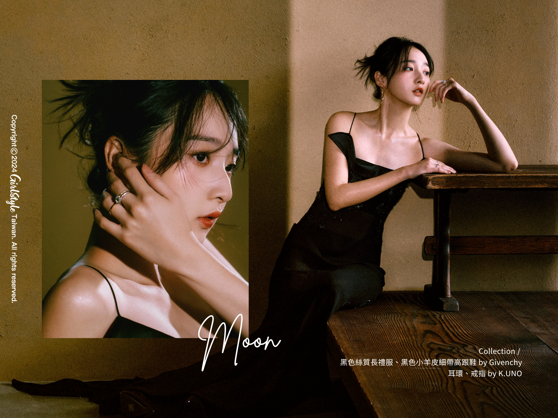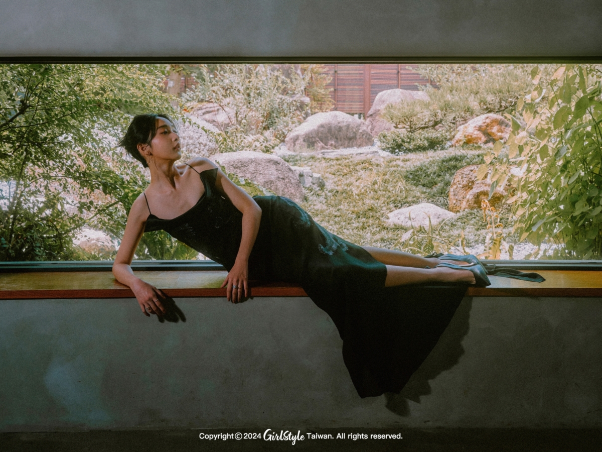 點開李沐的社群總給人一種平靜療癒、卻又帶點神秘的 INFP 人格特質,喜歡穿著簡單服飾紀錄生活,私服穿搭上並不刻意外顯,她說到:「平常大多數時間還是穿著我的睡衣,如果突然有一個心情是好想打扮喔,我可能會往法式風格方向走。」因此第二套拍攝選擇以法式裙裝呈現出李沐神秘又帶點異想不到的迷人魅力,當我們問到認為自己是叛逆黑、優雅黑或是神秘黑?李沐驚喜說出:「我會喜歡劇場黑,就是工作人員穿的黑衣服,我喜歡降低自己存在、同時又很來去自如的黑色,那種感覺讓我覺得很自在、很中性。」這套 Givenchy 黑色絲質長禮服,搭配黑色小羊皮細帶高跟鞋,詮釋出李沐嶄新面貌,纖細嬌小身材中充滿了骨氣與韌性。