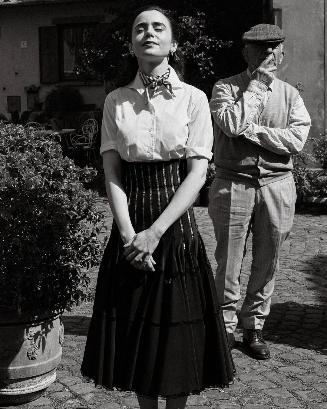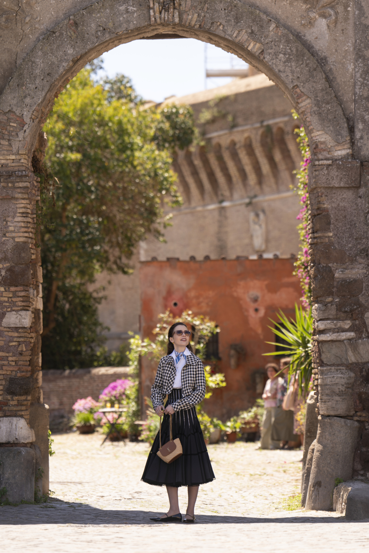 艾蜜莉在與馬切羅同遊羅馬時,身穿格紋外套搭配白襯衫、條紋高腰裙,再綁上領巾作為點綴,戴上復古淺橘色墨鏡,大波浪捲髮,手拿 Saint Laurent 拉菲草迷你 MANON 手袋,這身造型似曾相似,原來是《羅馬假期》奧黛麗赫本的經典造型,艾蜜莉即便復刻全身穿搭,卻又注入了一股清新迷人魅力,重新詮釋經典。