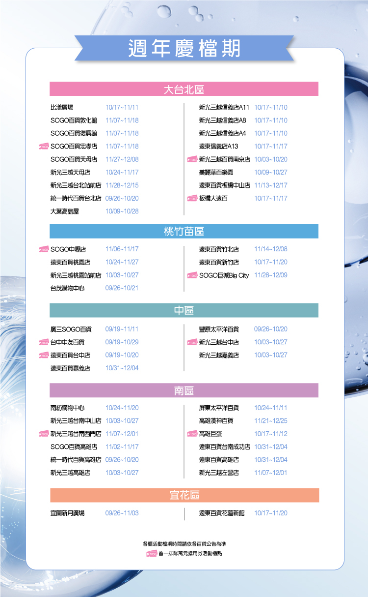 限定櫃點:新光三越台中店、忠孝SOGO、新竹巨城、中壢SOGO、台南西門、漢神巨蛋、板橋大遠百、台中遠東、台中中友、南西三越