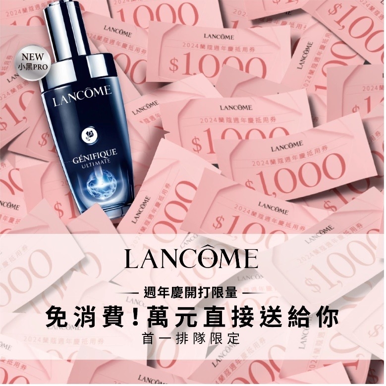 *數量有限,送完為止,每人限贈一份(1000面額x10張)。*本券單筆消費NTD2,000可抵用一張,可累計使用,但不與其他活動優惠券重複使用。*本券限排隊櫃台使用,必須蓋店章方為有效抵用券,逾期或跨店使用無效。*本券限於2024年周年慶開打首四日內使用完畢。*蘭蔻保留更換活動與解釋和變更權利。