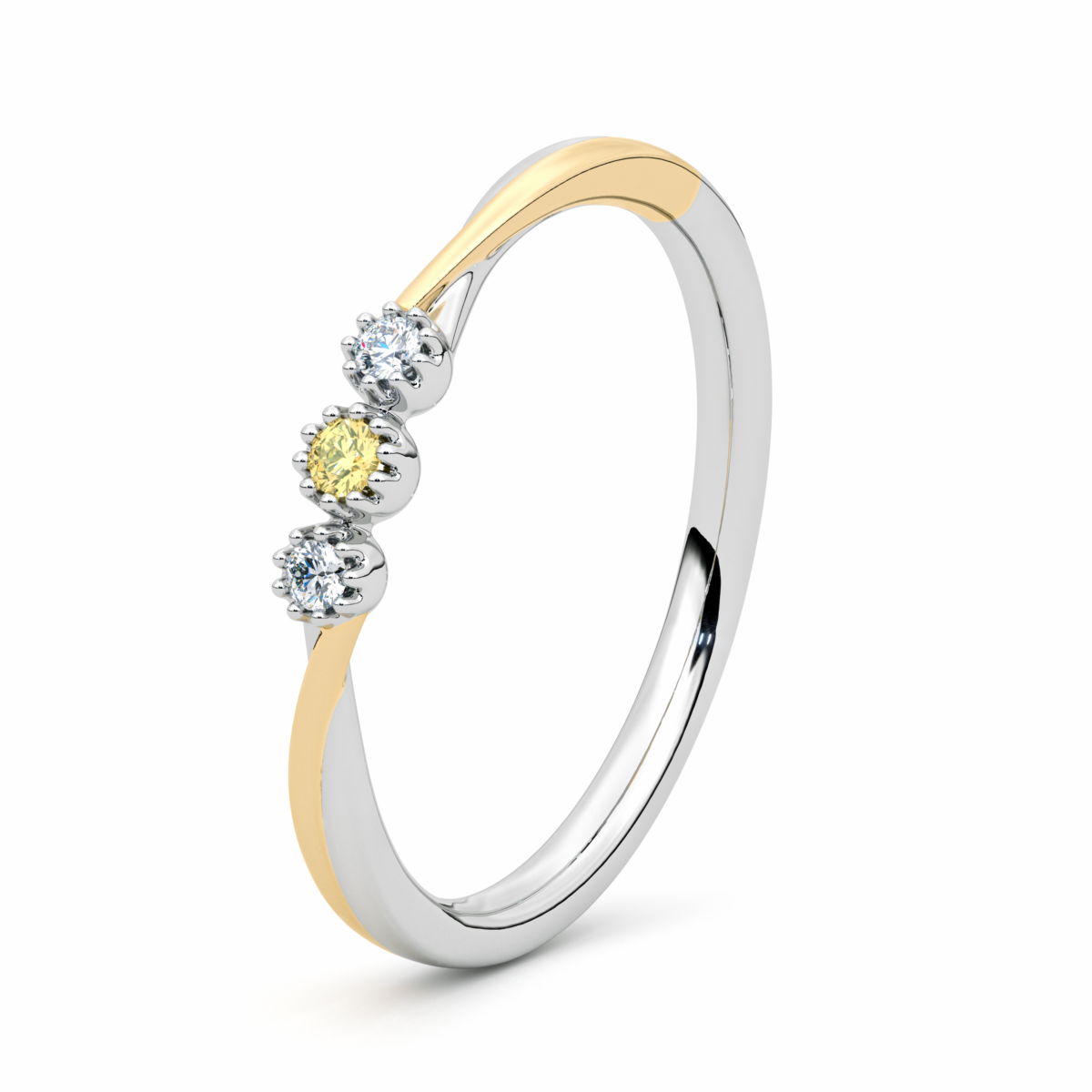 三顆鑽石細緻鑲嵌,象徵森林中最璀璨的光芒,中央黃鑽巧妙的詮釋如同美麗蝴蝶輕輕停留在指尖的片刻,展現兩人愛情的純真與美好。流線型的戒身如林中小徑,引領著兩人步入充滿可能性的未來。