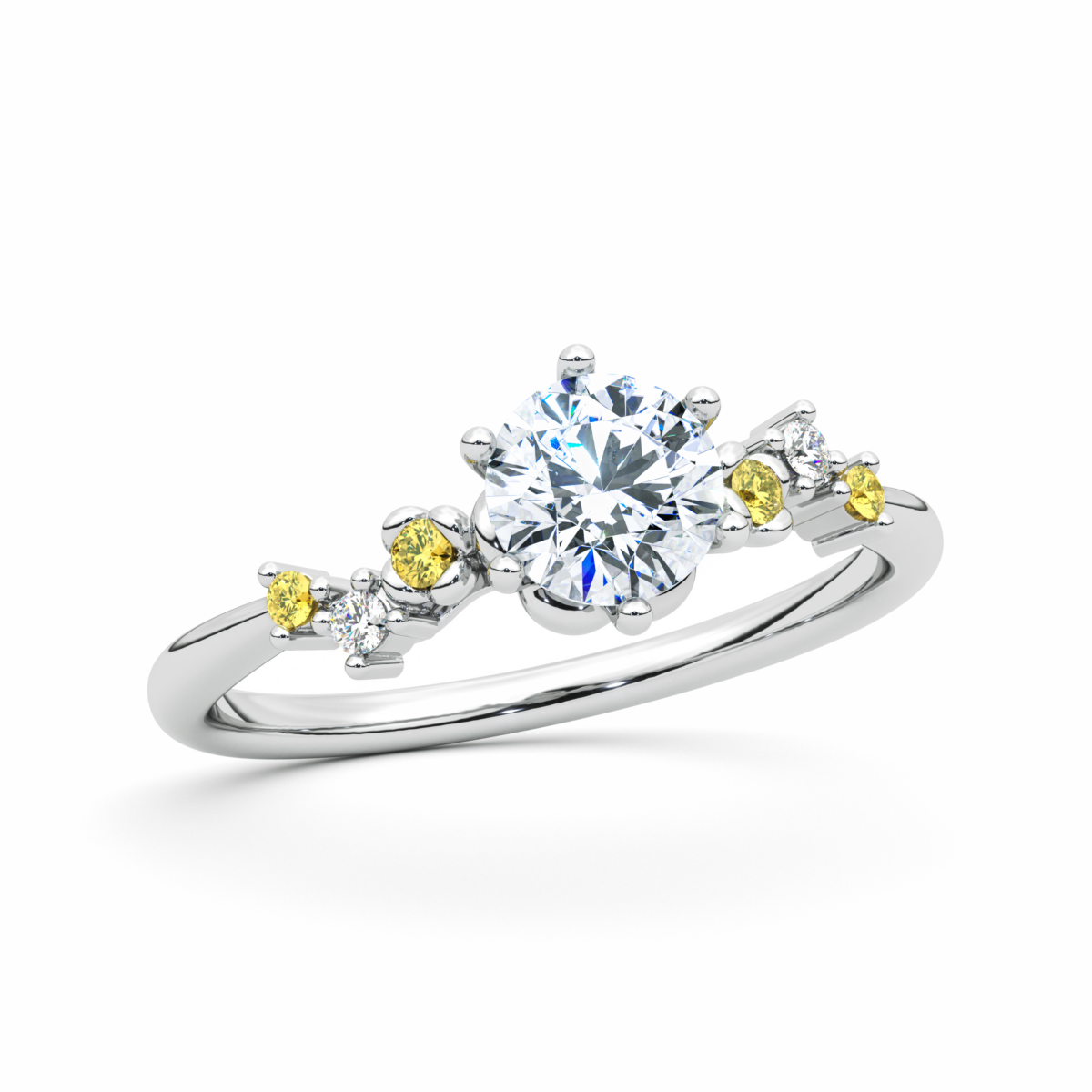 這款鑽戒以小鑽象徵盛開的小花,環繞主鑽,黃鑽的金黃色光芒如同花園中的陽光,為花朵賦予生命力,讓愛情不斷綻放。每一朵小花象徵著兩人愛情中的每個美好瞬間,匯聚成永恆的花圈,見證彼此不變的承諾。