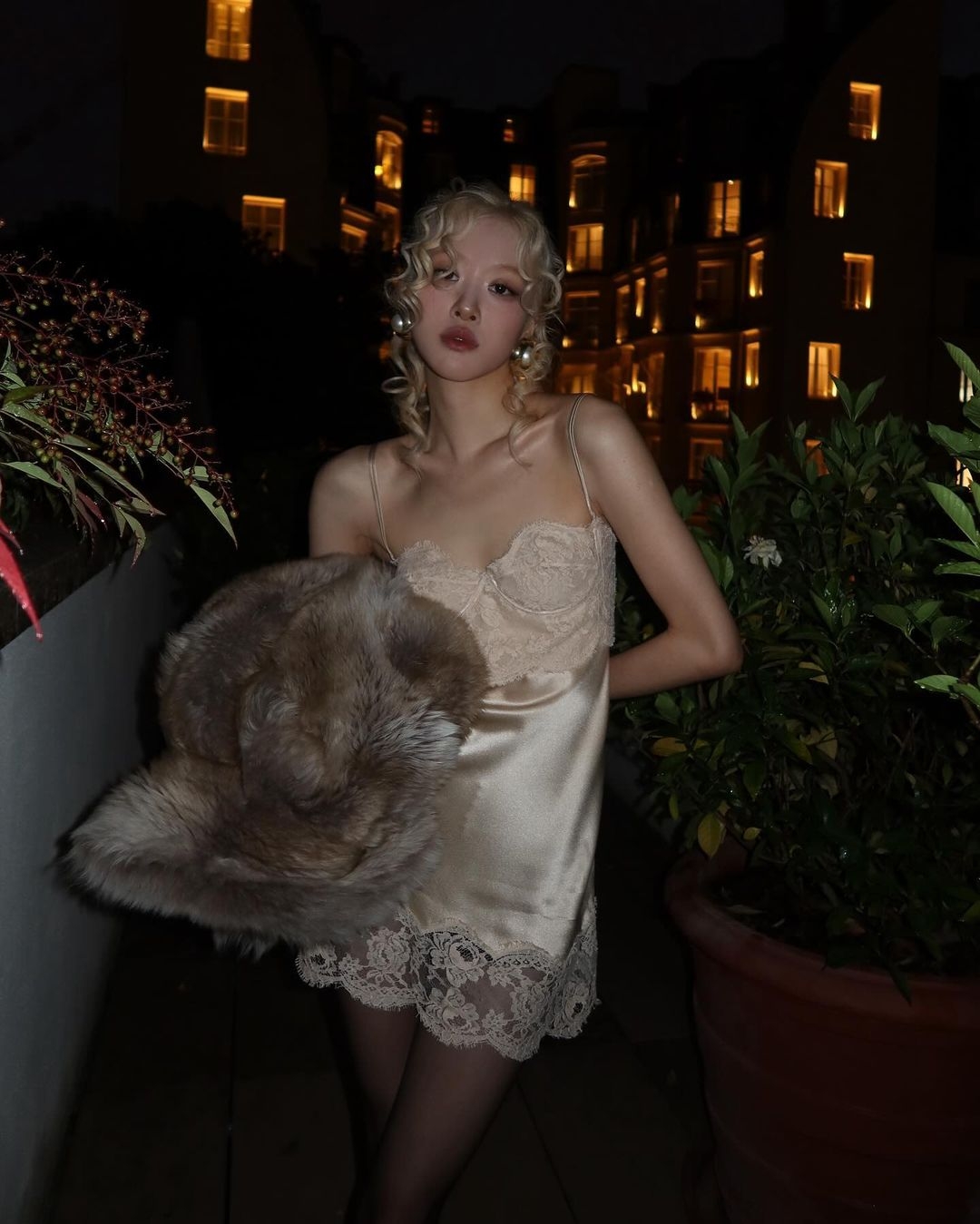 全是最適合穿上 YSL 造型的人絕非是 Rosé 了,每回現身時裝週都能驚艷大家,這回出席 Saint Laurent 2025 春夏大秀展現了與以往稍稍不同的風格,更狂野、更性感撫媚!Rosé 以香檳色細肩帶蕾絲洋裝搭配裸色皮草大衣,裙身由絲綢材質製成,胸前與下襬點綴上蕾絲細節,搭配黑色淺色透膚絲襪和金色絨面尖頭高跟鞋,重點是 Rosé 一頭羊毛捲金色短髮,更顯得復古華麗,簡直像個精緻洋娃娃一樣。