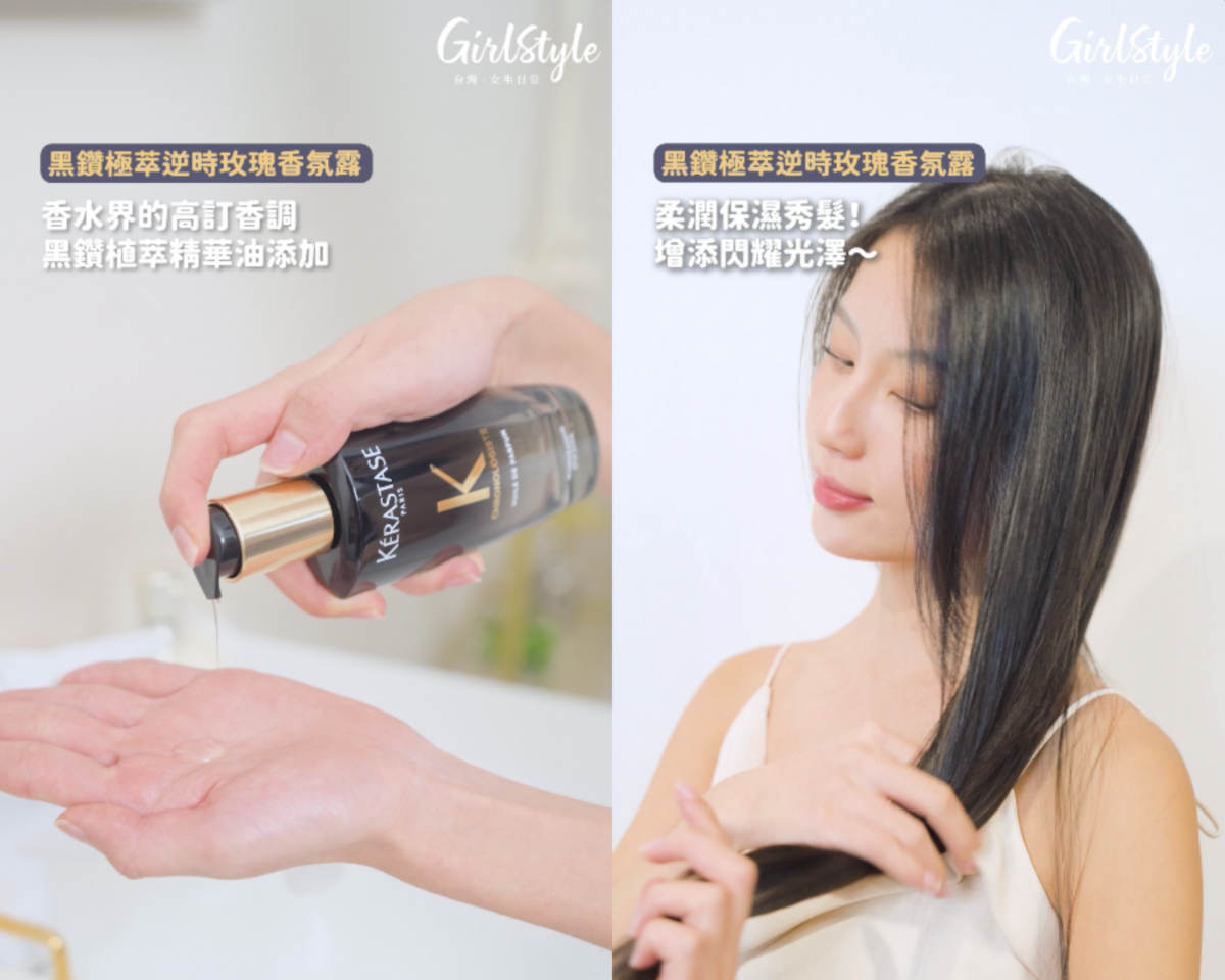 吹乾頭皮、髮絲後,使用「黑鑽極萃逆時玫瑰香氛露」進一步為秀髮增添閃耀光澤、強化保濕力!添加黑鑽植萃精華油,包含摩洛哥油、葵花籽油、茉莉精油和沒藥精油,一抹快速滲透髮芯,一瓶就能達到深層修護、撫平毛躁、保濕潤澤的多重效果!上完髮油的秀髮變得更加強韌閃耀~而且時時散發頂級玫瑰香氣!讓高訂香調給你一整天的療癒好心情!迷人指數更加分!