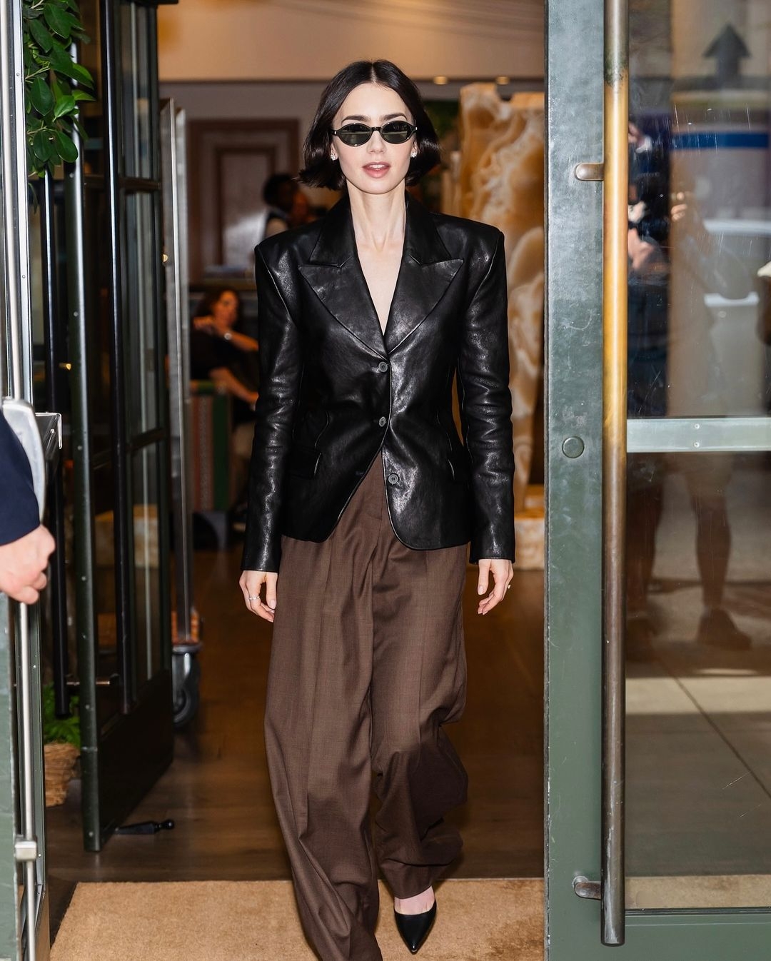 誰說黑色穿搭只能是洋裝?Lily Collins 這套選擇波蘭設計師品牌 Magda Butrym 的黑色收腰皮衣、棕色寬褲亮相,品牌結合波西米亞與搖滾美學風格,迅速收穫各大時尚名人喜愛!黑色皮衣絕對是秋冬必備單品,腳上同樣穿 Manolo Blahnik 黑色尖頭高跟,配戴 Saint Laurent 墨鏡,帥起來根本沒男生的事!