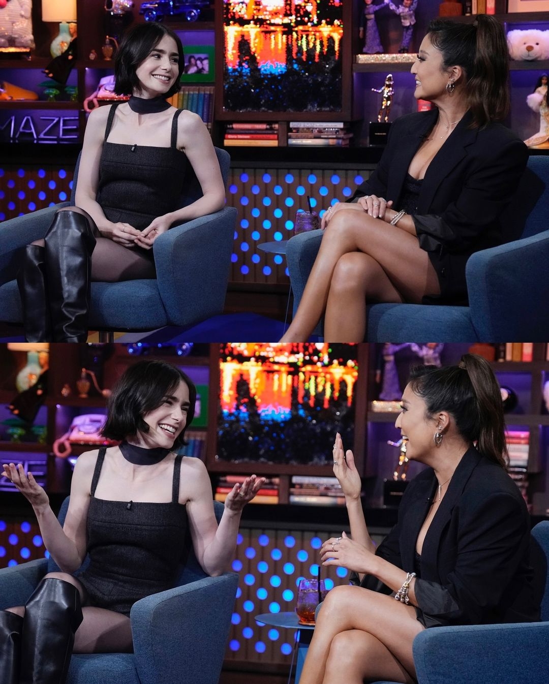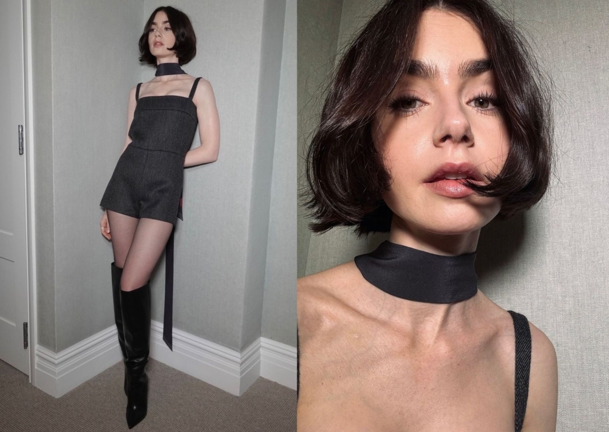 Lily Collins 出席談話節目時,身穿一套 Gucci 深灰色羊毛連身短褲現身,服裝面料採用秋冬感羊毛製成,而頸部造型以一條緞面絲巾隨意圍繞,將兩者不同材質混搭的細膩又巧妙,搭配黑色透膚絲襪和 Christian Louboutin 黑色皮質長靴,一頭短髮微亂捲亮相,有股凌亂的高級時髦感。