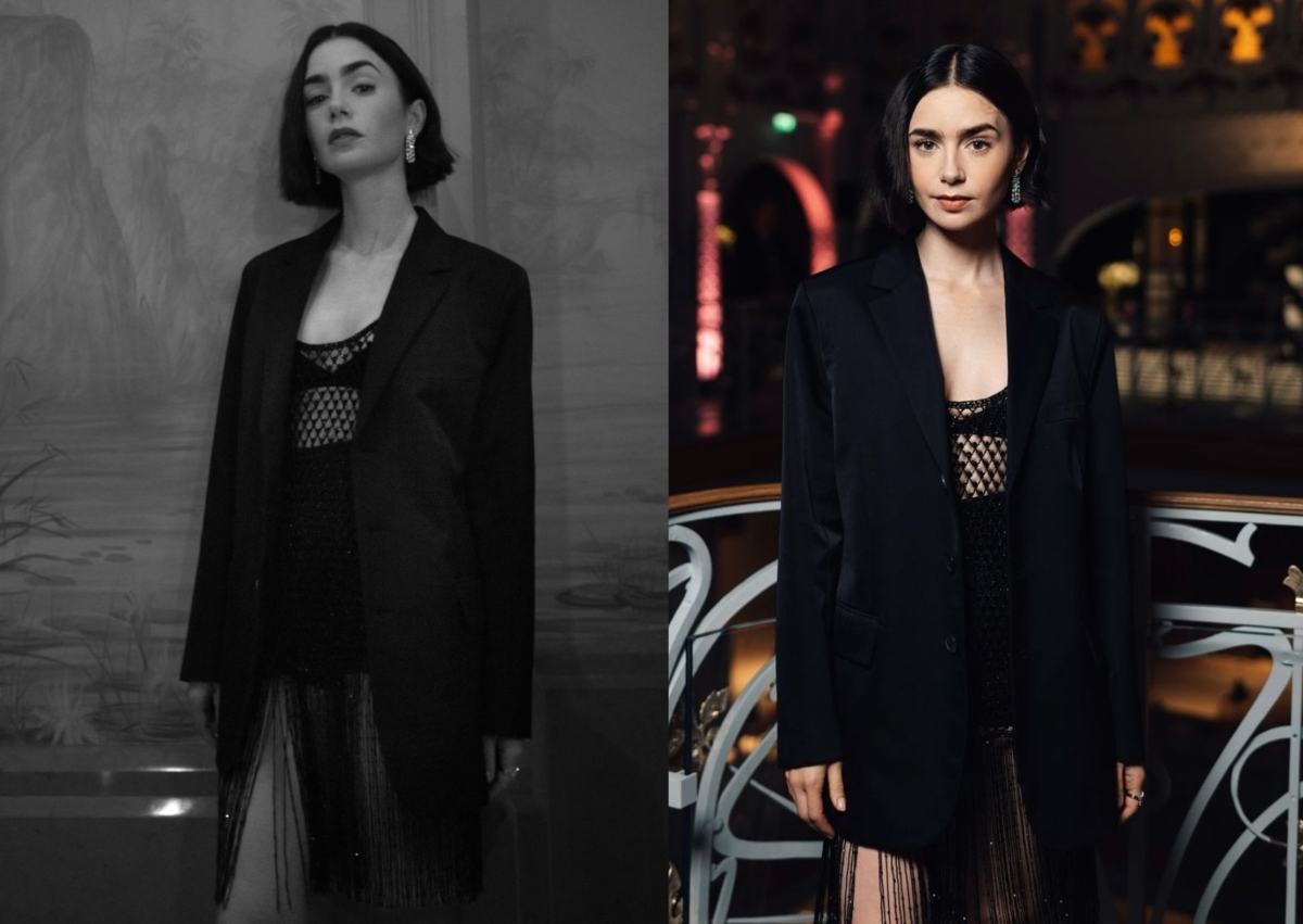 Lily Collins 總算穿上 Dior 了!這套來自Dior 2024 早秋高級訂製服,以黑色網狀材質組成的外罩衫,內搭精緻低胸內衣,外面搭配挺版西裝外套,下擺飾有大量流蘇設計,走起路來隨風擺動,腳踩出鏡率很高的Manolo Blahnik 高跟鞋,配戴 Cartier 水鑽垂墜耳環,有種女強人既視感!