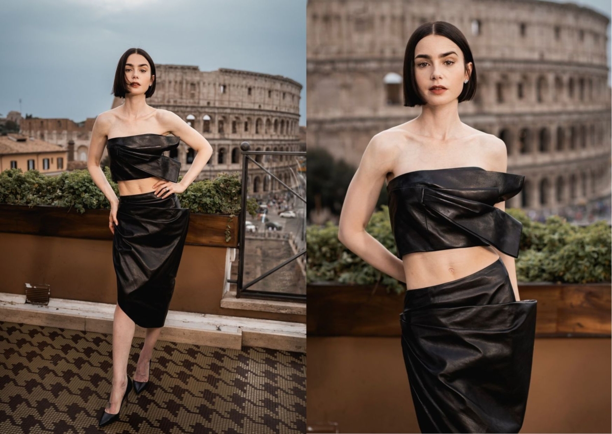 Lily Collins 在羅馬的媒體攝影發佈會上,身穿 Givenchy 兩截式皮革裙裝,平口抹胸搭配高腰鉛筆裙,服裝剪裁造型刻意不規則、突出,大方露出鎖骨線條和結實腹肌馬甲線,搭配隨性俐落短髮,在性感中注入一絲帥氣。