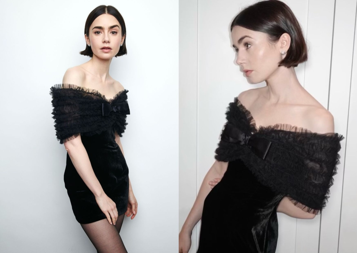 Lily Collins 出席宣傳時,選擇擅長刻畫裙裝的倫敦設計師品牌 Alessandra Rich 天鵝絨迷你裙亮相,上身飾有蕾絲鑲邊、蝴蝶結點綴,異材質拼接感十足,搭配黑色絲襪、腳踩 Manolo Blahnik 高跟鞋,將短髮俐落勾至耳後,清楚露出 Cartier 珠寶耳環,展現大器又優雅的風範!