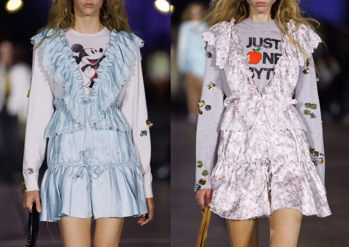 除了大秀前搶先曝光的米奇高跟鞋之外,標誌性 Swipe Bag 也推出 Mickey Mouse 版本,秀上許多服裝細節上也可以看到與 Disney 一起打造的聯名單品,俐落摩登的廓形點綴上荷葉邊、花朵和蝴蝶等,也可以看見魔女的尖角被放在連帽外套、領口和鞋款上,以不同形式詮釋公主的面貌。