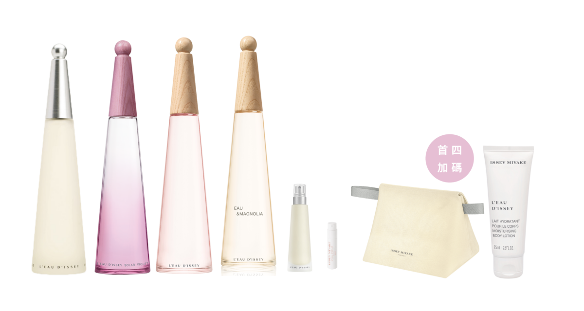 日本極簡美學的代表大師 三宅一生 ISSEY MIYAKE 一生之水系列,不分性別、不分性格的中性氣味不只在日本大受歡迎,也是台灣許多名人的心頭好呢!全新的《一生之鹽淡香水》、經典《 一生之水女香》都納入了週慶組合,買大香送小香的優惠,旅行愛好者一定要搶購!