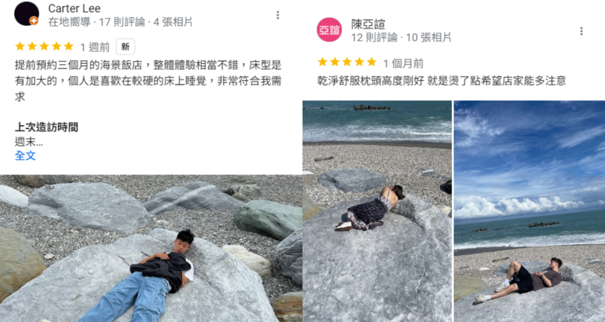 很多人在退房後(?)也留下許多有趣認真的評論,說:「很滿意這間戶外海景飯店,床型是加大King size很讚」、「我剛好喜歡硬床」、「整體舒適感不錯只是燙了點」、「躺在這休息真的很放鬆」、「有海景,周圍還有自然白噪音幫助入眠」、「已購買 小孩很愛躺」、「建議下午或傍晚去,白天超燙」、「這個俗頭真的很平還附枕頭,就只差一條棉被」、「可惜俗頭床是背對海,希望店家可以改善」、「需現場等待前房客退房,低消躺五分鐘」。