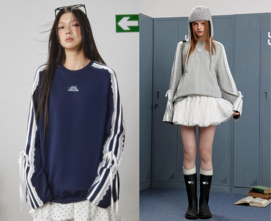 再來就是比較休閒感的運動風,秋冬的鬆弛感穿搭當然是要穿長袖T恤啦~這件芭蕾風的長袖T恤是由厚針織棉布料與蕾絲、針織帶拼接而成~這件完全展現了個性與甜美的完美融合!袖子還可以綁上今年非常流行的蝴蝶結元素,真的太可愛啦!