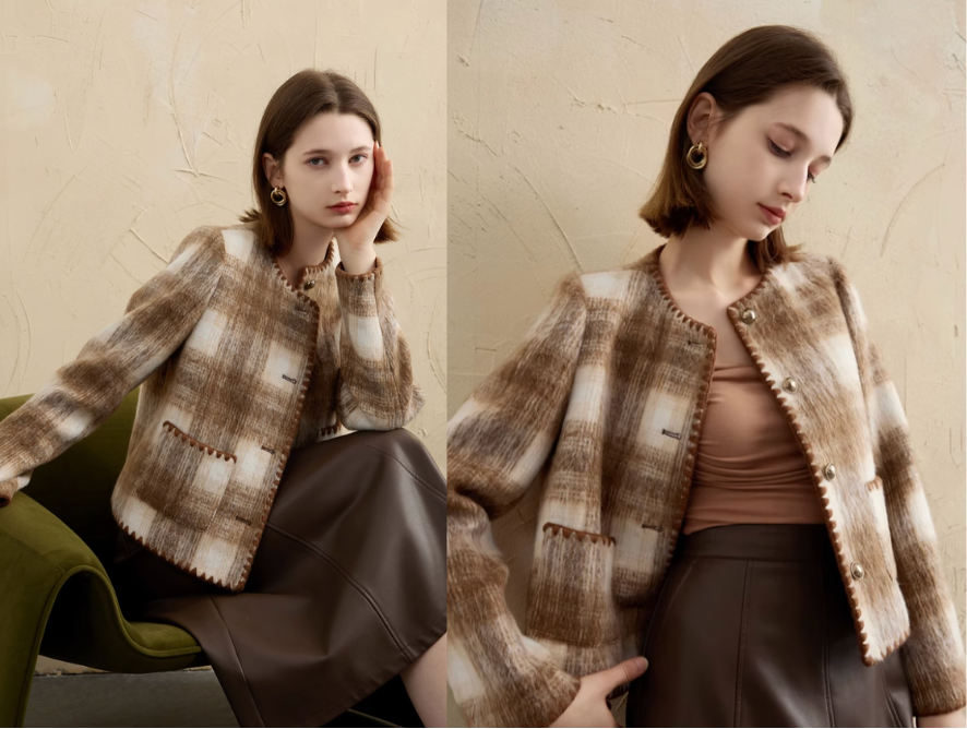 貝殼袖釦格子毛呢外套 (淘寶店家:三彩官方旗艦店)