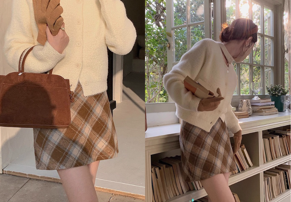 格紋是秋冬的必備經典單品,一件就能讓穿搭風格顯得不無聊,所以小編在秋冬最喜歡搭配格紋了~毛呢半身裙有顯瘦的A字版型設計,帶有學院風的文藝氣息,搭配咖啡色或是米白色的上衣、配件,化身暖色系溫柔小姊姊~推薦女孩們可以搭配長靴,不僅能夠保暖雙腿,還能更增添時髦感!