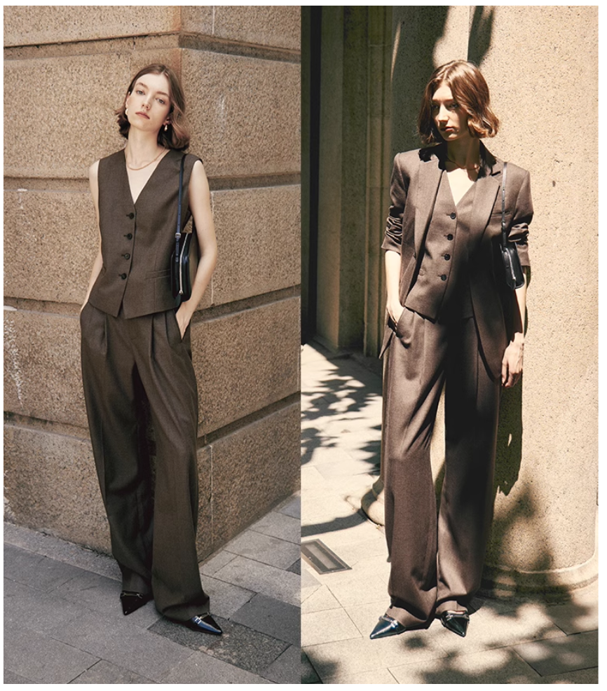 山羊絨的面料增加了穿著舒適感及保暖度,肩膀的墊肩更增加了高級氛圍感,搭配同色系腰身馬甲及西裝褲,整體搭配得一致性及俐落剪裁,在簡約中散發出不一樣的輕奢質感~非常適合上班族,不論是日常上班突然有重要會議或是下班隨時要來場約會都可以!