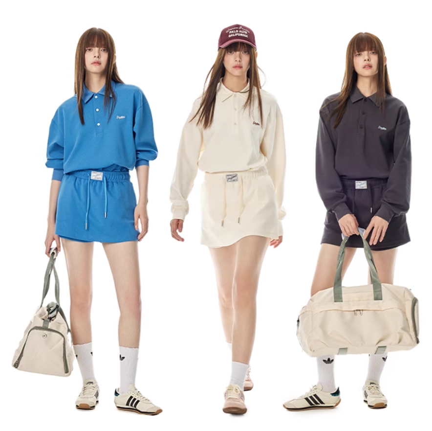 如果今天想要走中性但又不想要穿常見的黑白灰色,也可以選擇高飽和度顏色的運動套裝~讓穿搭看起來更活潑!套裝是由POLO領長袖與褲裙組合而成,可以將上半身的POLO領長袖紮進去,更顯俐落。女孩們可以再搭配棒球帽跟運動鞋,讓你的運動穿搭更豐富~