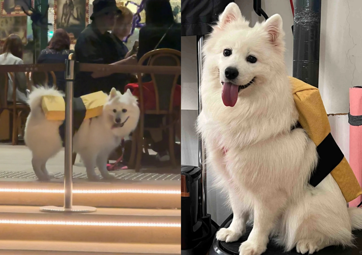 如果你的狗狗是白色的話,可以扮成壽司!玉子燒最簡單~準備長方形的墊子黏上黃色的薄毛巾,再用黑色魔鬼氈粗綁帶一同連墊子綁在狗狗的身上,巨大行走的玉子燒就出爐了,超有創意的打扮走在路上局絕對回頭率超高。