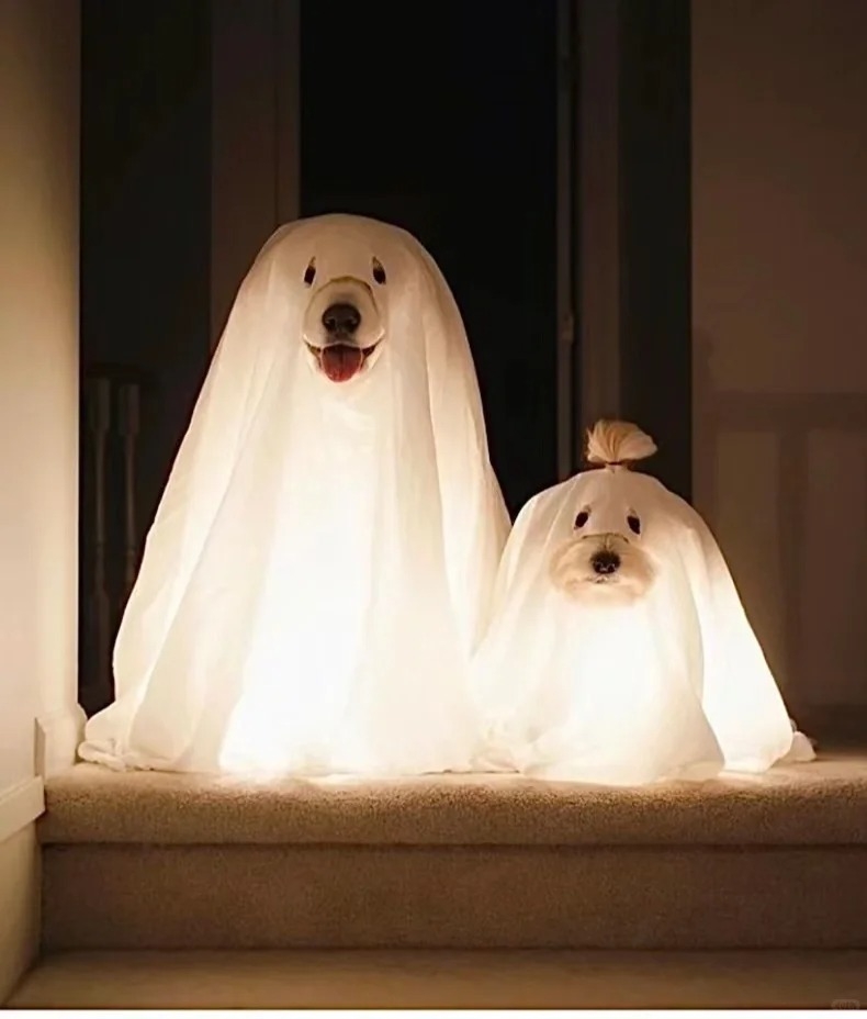 想要可愛又簡單、花費少的裝扮就扮成幽靈狗狗吧!只需要準備一塊白布,剪裁成狗狗大概需要的長度,接著剪出眼睛、鼻子與嘴巴要露出來的洞口,套在狗狗身上,你家就會出現一隻可愛的幽靈狗狗(笑)。不露出腳走來走去的時候真的會像是用飄的一樣,也可以在布裡面黏上小燈看起來會更有幽靈的透明感~