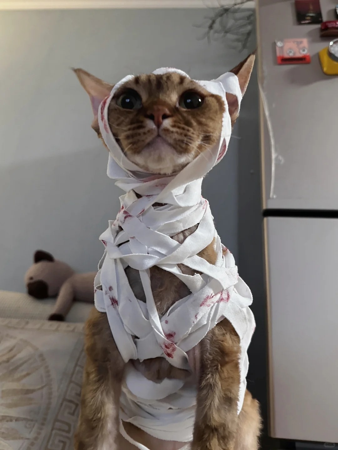 貓咪在埃及世界中是屬於神聖的象徵,埃及人不僅很愛貓,連神話中都有貓咪形象的神,埃及人也會將心愛的貓咪製作木乃伊保存,因次沒有其他動物比貓咪更適合裝扮成木乃伊了!可以用繃帶輕輕纏繞貓咪的身體跟頭,接著在繃帶上隨意抹上口紅或咖啡色眼影,就會像是剛從墳墓裡復活爬出來一樣的木乃伊貓貓XD