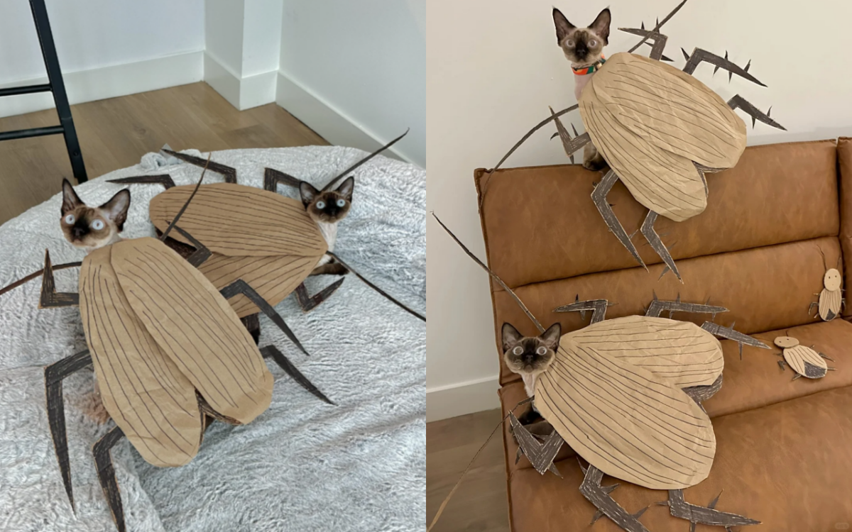 想要搞怪的話可以參考「蟑螂貓貓」XD 有網友用紙箱簡單剪出蟑螂翅膀、角和觸鬚畫上紋路後黏上背帶,給貓咪穿上後,完全毫無圍和感,根本就是隻超大的行走蟑螂!!而且爬上沙發也太像準備起飛的蟑螂,這絕對是萬聖節最可怕的裝扮...。