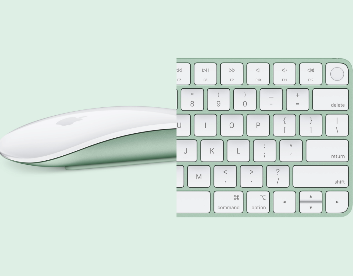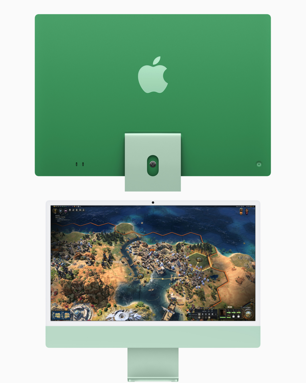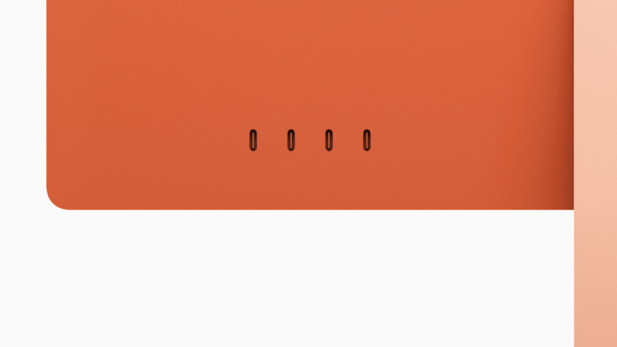 新款的iMac這次推出七款鮮豔活潑的綠色、黃色、橙色、粉紅色、紫色、綠色和銀色,大膽的顏色背面與正面的漸層色設計,使用24.5吋4.5K Retina 顯示器奈米紋理玻璃,讓整台iMac看起來色彩舒適流暢。每一台 iMac 都配備顏色相襯的繽紛巧控鍵盤與巧控滑鼠,或是可選購的巧控板,而且所有這些配件皆具備 USB-C 埠,使用者只需一條電線,即可為所有最愛的裝置充電。