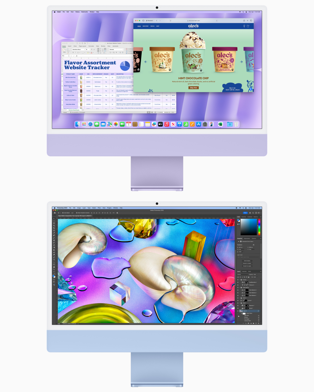搭載強大M4晶片的新款 iMac,以16GB 統一記憶體為標準配置,最高配置可達 32GB。相比搭載之前搭載的M1,機型生產力效能快達1.7倍、照片編輯和遊戲等繁重工作流程的處理速度更可快達 2.1 倍、Safari瀏覽的性能最快可達1.5倍、神經網路引擎快超過3倍。不只如此,內容創作者在《Adobe Photoshop》和《Adobe Premiere Pro》等App中剪輯和套用複雜的濾鏡和效果時,照片和影片剪輯效能都比搭載M1 iMac 最高可達 2.1 倍。而遊戲玩家在享受遊戲體驗時,能明顯感受到令人難以置信的流暢感,M4畫面的影格率比搭載M1的 iMac 最高可達2倍。