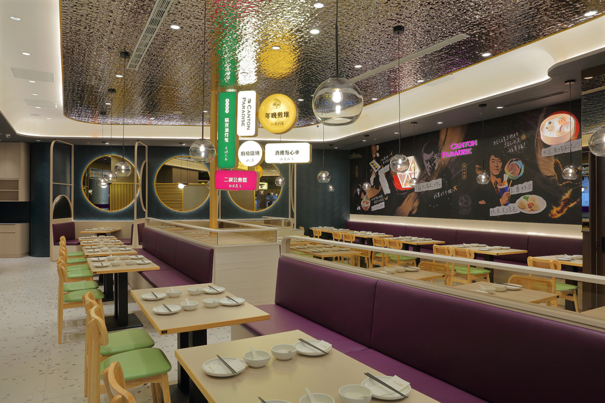 餐廳空間以灰鏡、槌目金屬天花與紋理豐富的壁紙營造出流金繁華之感,主題牆設計靈感來自《少林足球》、《功夫》、《葉問》與《一代宗師》電影的經典畫面與對白,結合招牌菜色像後重新詮釋輸出,成為一面超有共鳴的巨幅海報,執行董事劉素華表示,香港輝煌的電影產業也是台灣人津津樂道的香港印象。而「樂天小香港」台灣首店落腳以體育競技著稱的大巨蛋樓下,餐廳視覺焦點便以功夫電影為主,她強調:「伴隨品牌展店地區之個別特色,未來可見更多主題電影與美食結合的巧思。」此外,店內羅列港式俚語的樹牆裝置也很吸睛,句句雋永、博君一笑,用餐更添好心情。