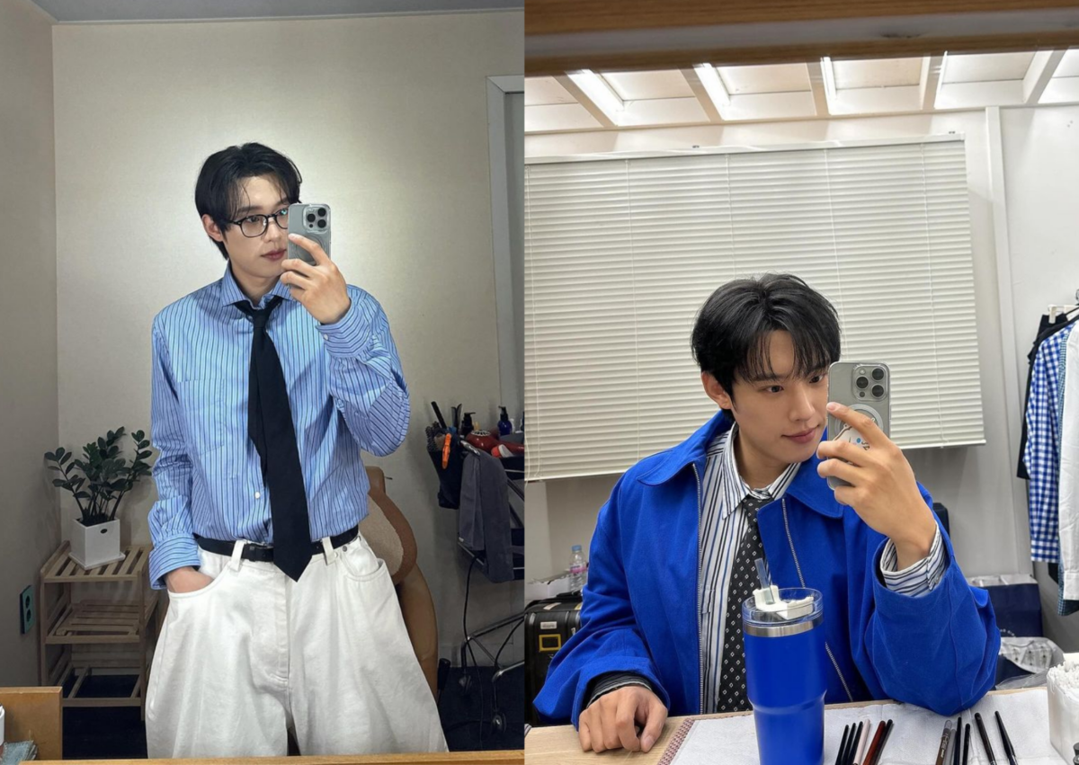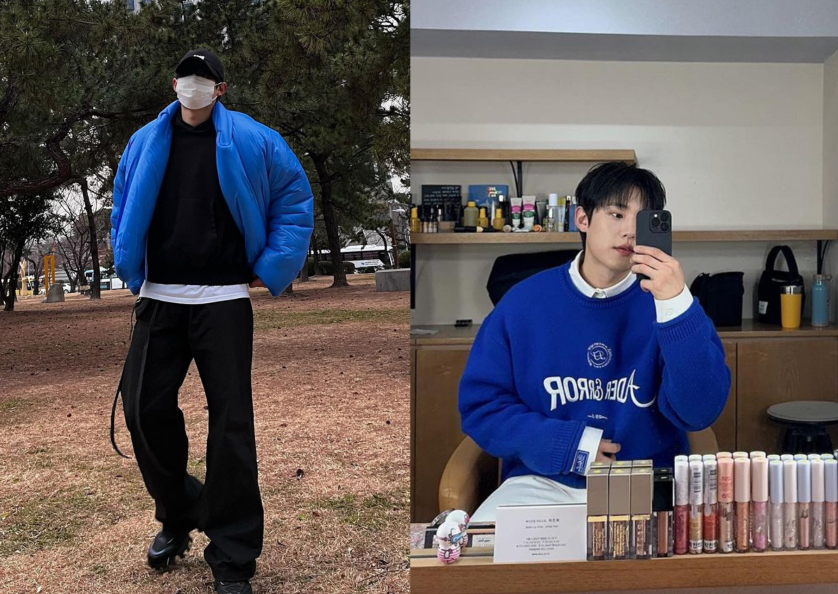 打開金聖喆的社群,可以發現他特別喜歡「藍色系單品」,私服出鏡率非常的高,像是襯衫、夾克、鋪棉外套和大學T,都以藍色系為主,上身採用鮮豔色調,下身則選擇了簡約的黑、白色,讓整體穿搭不會過度突兀、又能增加造型感,潮流中帶點個性。