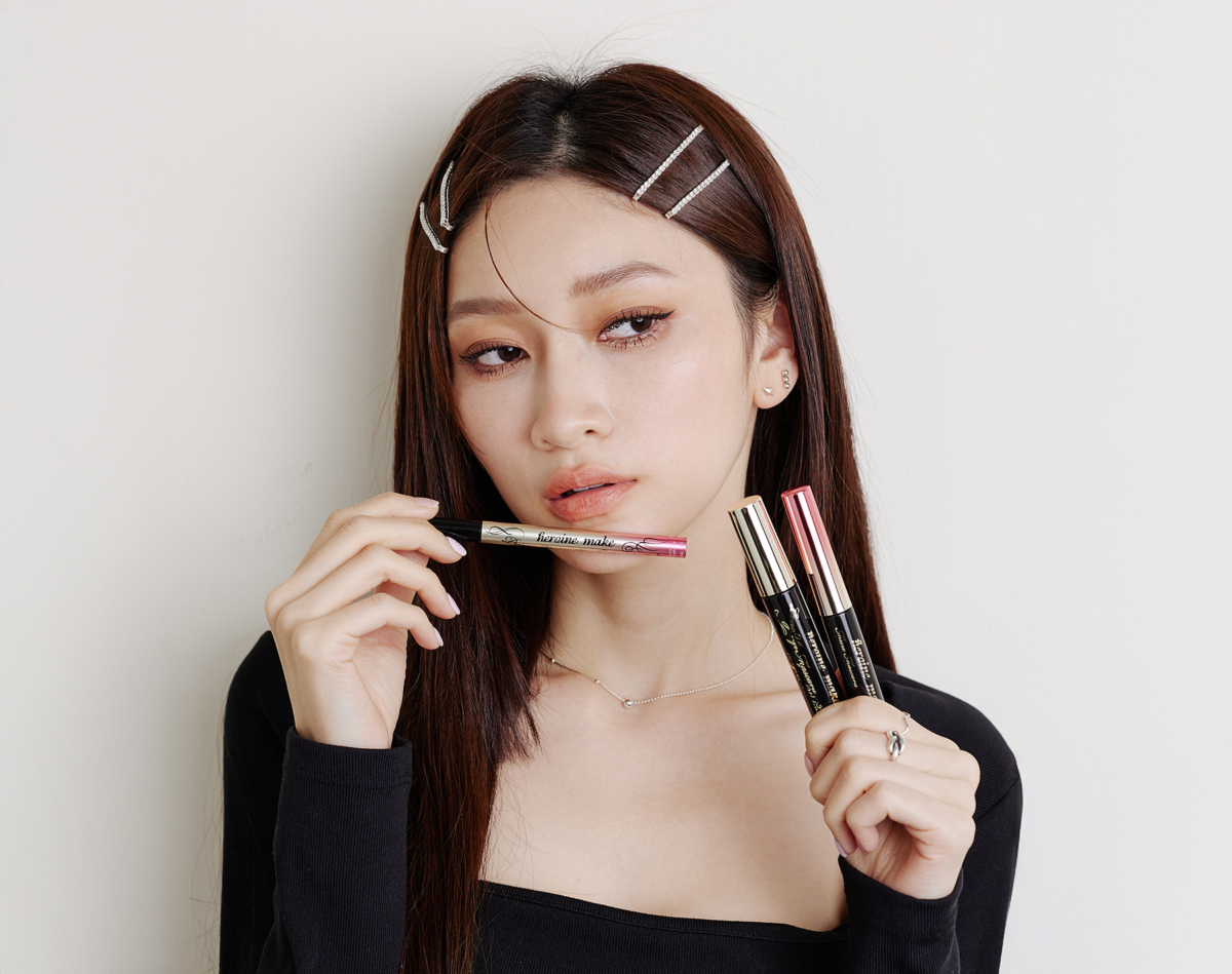 2015年韓流引爆的女團無辜大眼妝令人難忘!粗平眉、大面積淺色眼影、以及纖長綻放的睫毛,讓眼睛瞬間放大,夢幻又甜美!吉利先用KISSME細睫控360°零死角防水睫毛膏打底,再用超!持久立挺翹長防水睫毛膏打造出娃娃般根根分明、又長又翹的睫毛,眼線則使用KISSME超!持久極細抗暈眼線液筆描繪細緻清純眼線 ,瞬間擁有甜美可愛、無辜性感的眼神,一秒化身偶像女團,返回少女時代迷倒全場!