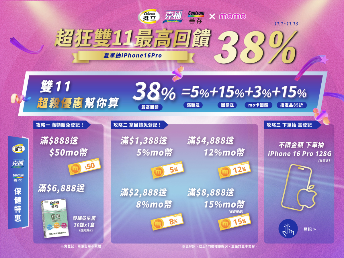 momo年度雙11購物嘉年華盛大展開,保健品優惠價、贈品大放送,善存、挺立、克補三大保健品牌最高回饋38%!