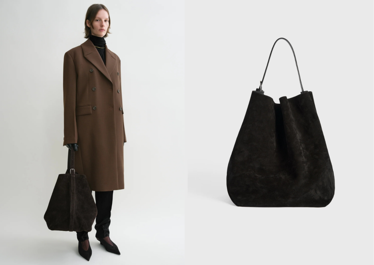 北歐小眾品牌 TOTEME 在本季上榜時尚平台 Lyst 以一件軍裝夾克成為爆紅單品品牌第五名,更讓這個小眾品牌讓更多人看見,設計理念圍繞在北歐極簡概念上,這顆手袋是採用麂皮面料製成,以濃縮咖啡棕色為基調,飾有銀色金屬五金,大包容量具有濃厚的復古意味,皮飾釦式的設計也是小亮點。