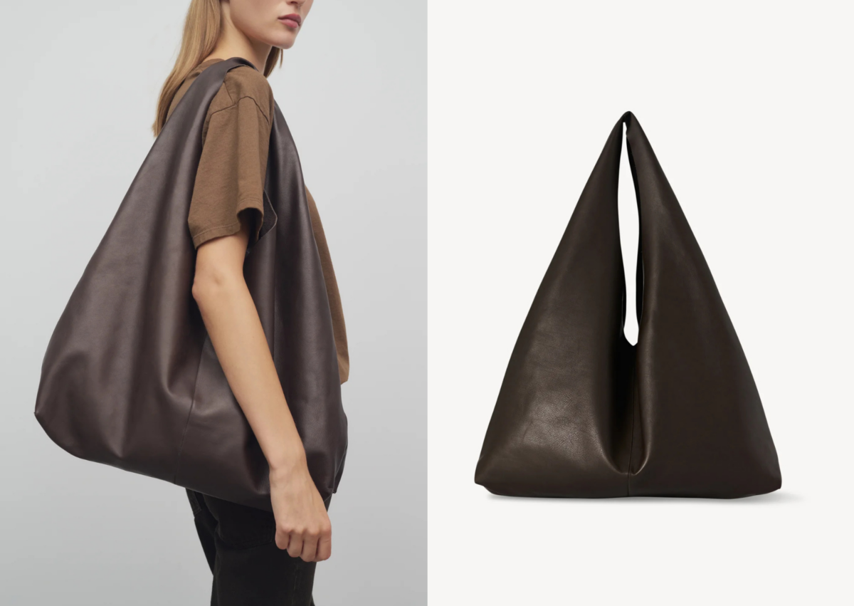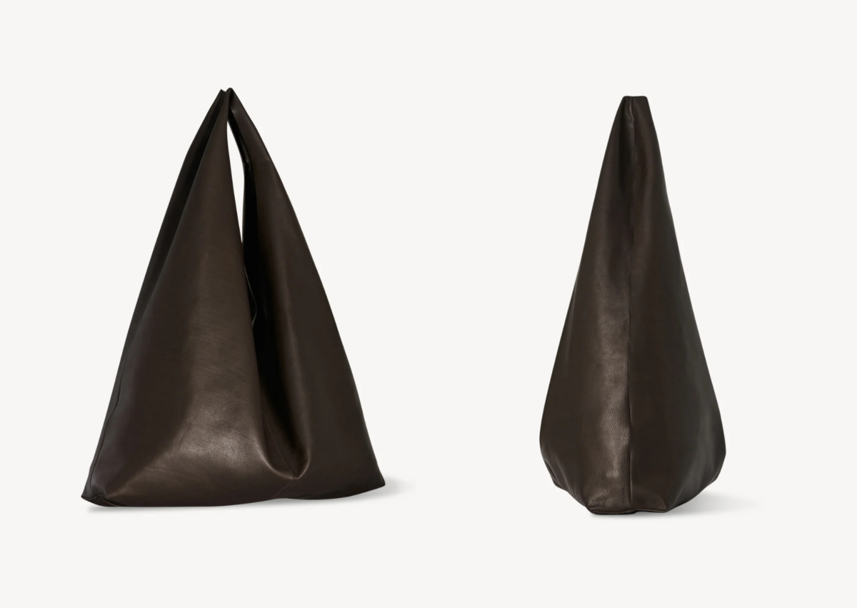 這顆是 The Row 最經典的流浪包型,包身以柔軟小牛皮製成,採用流體結構、中心縫線細節和垂墜手柄設計,不經意垂墜的線條廓形,看起來非常有個型,加上棕色色調,質感再次被拉高,整個包具有濃濃的鬆弛感氛圍,容量超大超能裝,編輯私心很愛這顆!