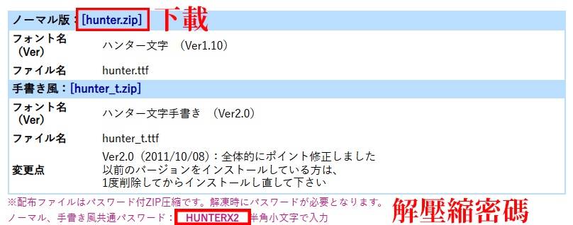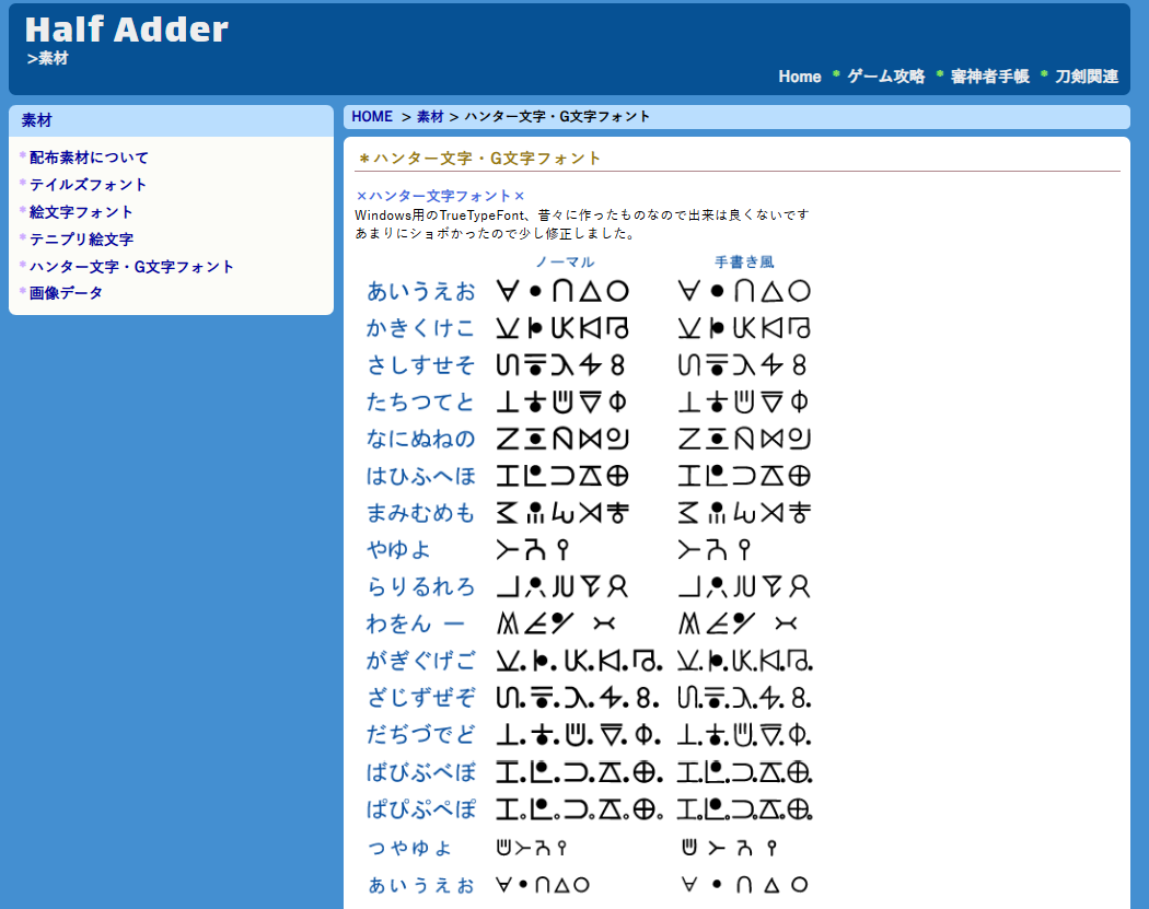 大家好奇自己名字的獵人文長什麼樣子嗎!有網友就將獵人文字製作成可以輸入的「獵人文字體」,只要到名為Half Adder網站的素材庫找到「ハンター文字・G文字フォント」文字下載區,看到日文與獵人文字體對照表之後往下滑,下載ノーマル版的壓縮檔案。