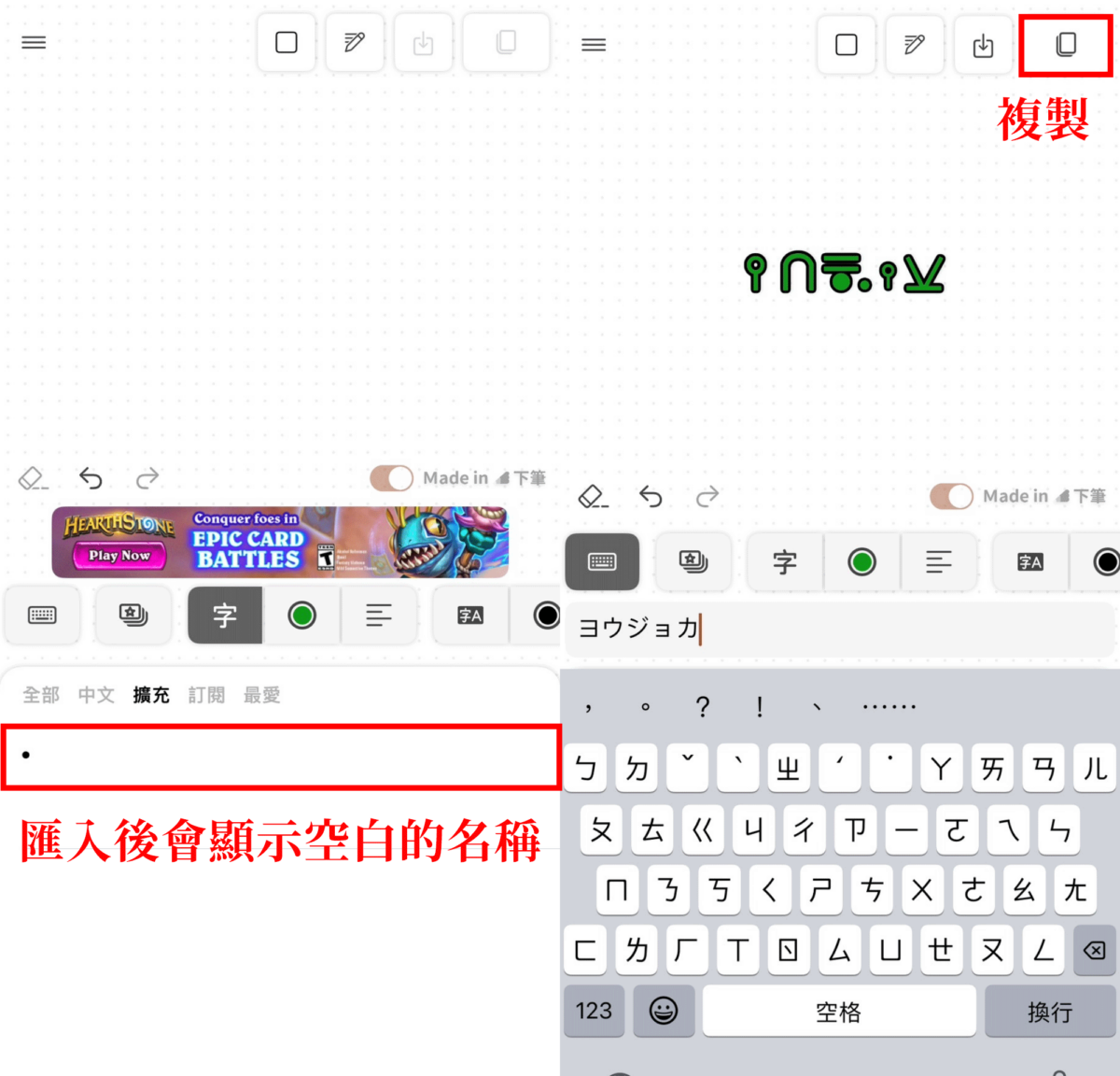 接著回到輸入文字的主畫面,找到剛剛匯入的獵人文字體,這時會發現文字擴充的地方是顯示空白的名稱,這是正常的喔~選擇空白的選項後,把已經翻成日文的名字複製貼上到文字框中,這時就會成功打出獵人文字了!!想要放在照片中的話點擊右上角的複製可以使用了,大家快去試試吧~