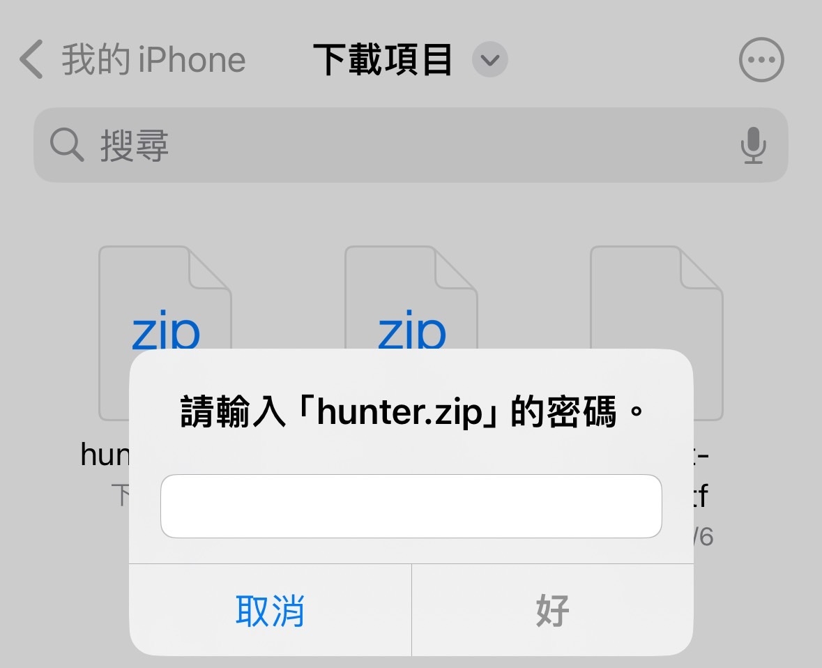 下載完成後到手機檔案的「下載項目」中找到剛剛的下載的壓縮檔進行「解壓縮」,這時需要打上「hunterx2」(小寫半形)密碼,就完成取得字體可以使用了。