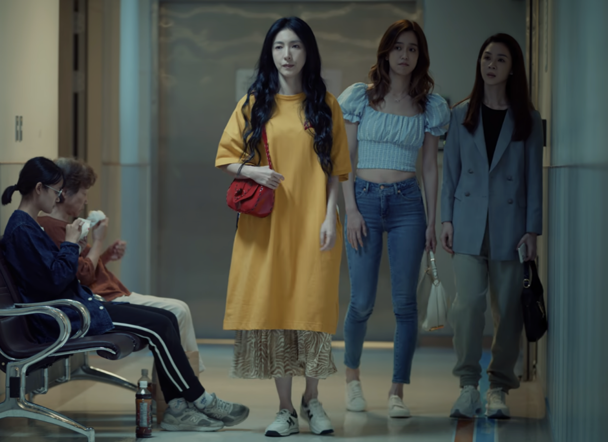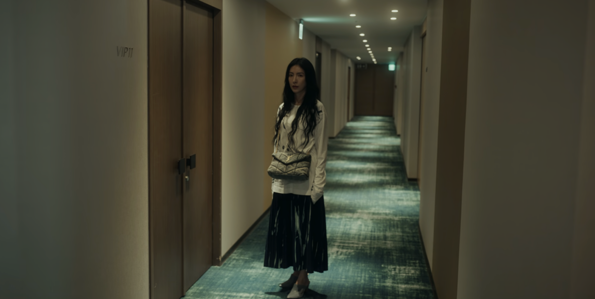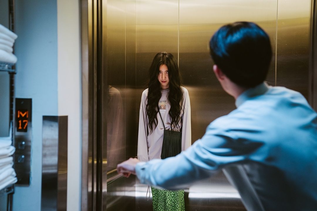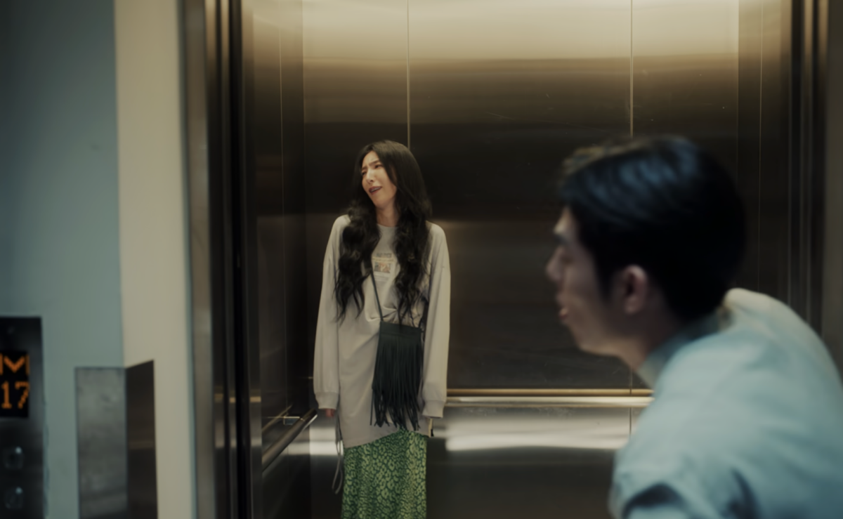 誰說長袖衛衣只能居家又休閒?周凡在電梯與流氓相遇時,就以這套灰色棉質長袖衛衣搭配綠色花卉印花長裙作為穿搭,一打開電梯門,整套造型既優雅又搶眼,加上長捲髮還有點文青氣息,如果裙身已經很鮮豔,那不仿選擇簡單樸素的上衣,斜揹的流蘇包也有畫龍點睛效果。