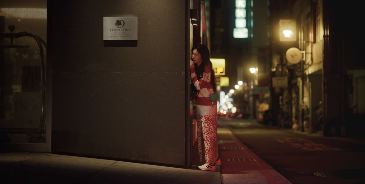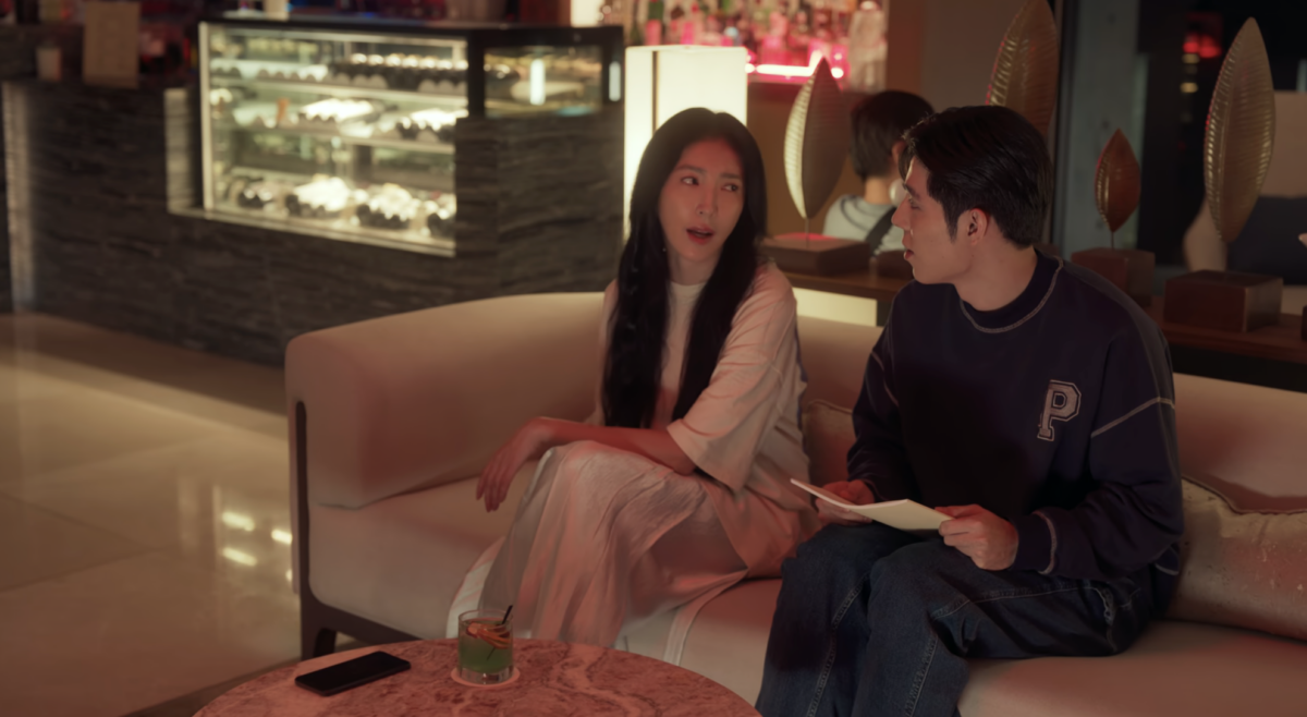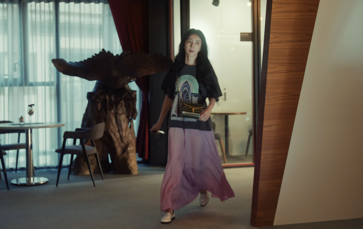周凡鼓氣勇氣回覆自己將答應影劇拍攝,前往製作人公司卻被要求試鏡、自我介紹時,以一身塗鴉印花 T-Shirt 搭配粉色長裙,上衣選擇灰色為底、帶有潮流街頭感的印花圖案,整身重點是帶有緞面+絲綢質感的粉色長裙,兩者面料很是衝突,卻在都不鮮豔的色調上做出和諧感。