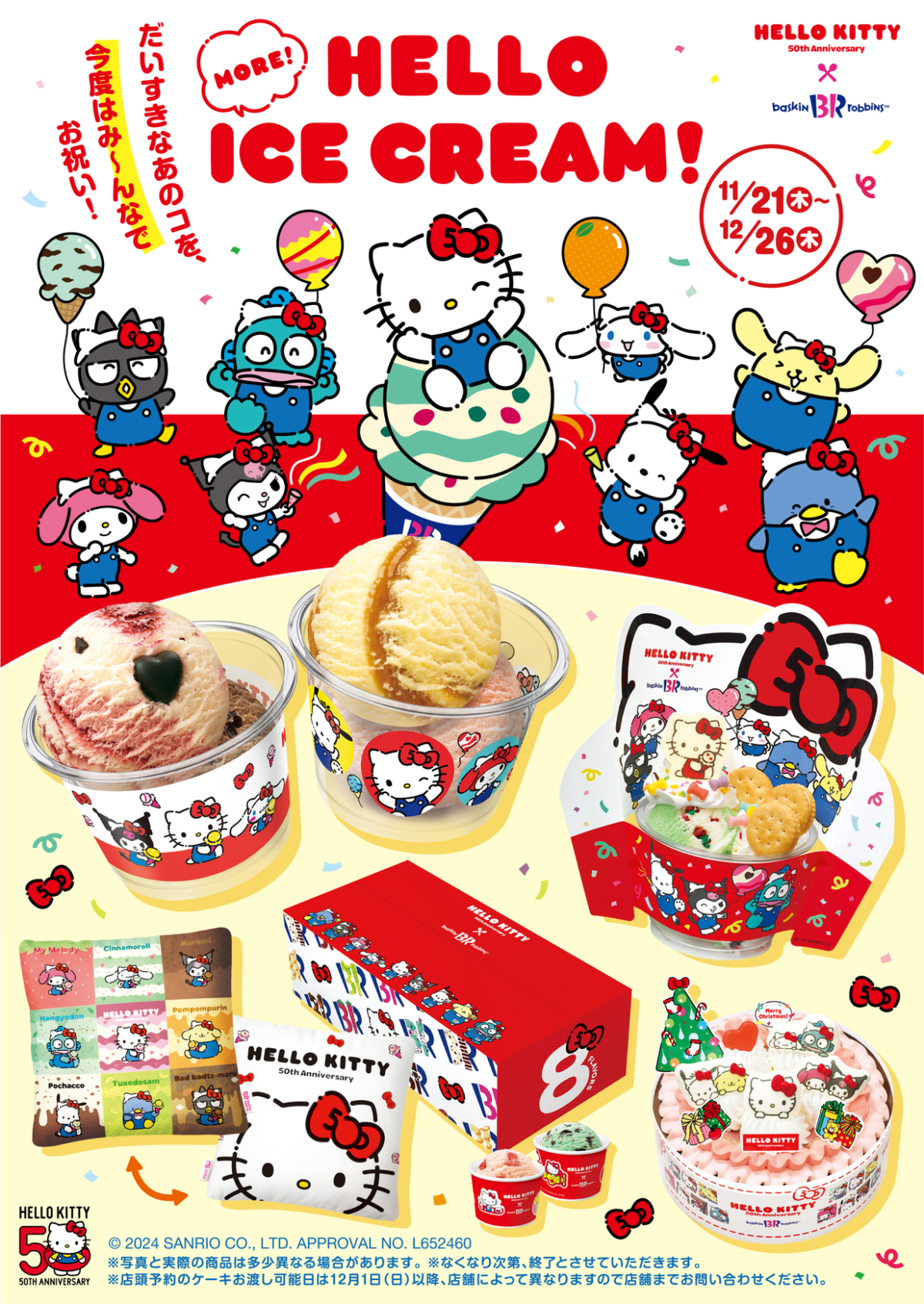 31冰淇淋又有新聯名了!日本31冰淇淋為慶祝Hello Kitty 50周年紀念,與三麗鷗合作推出「HELLO ICE CREAM」特別活動,繼第一彈引發熱烈迴響後,第二彈開始從2024年11月21日至2024年12月26日,一系列超繽紛冰淇淋與可愛到爆的包裝,還有限定周邊小禮物可以拿♡