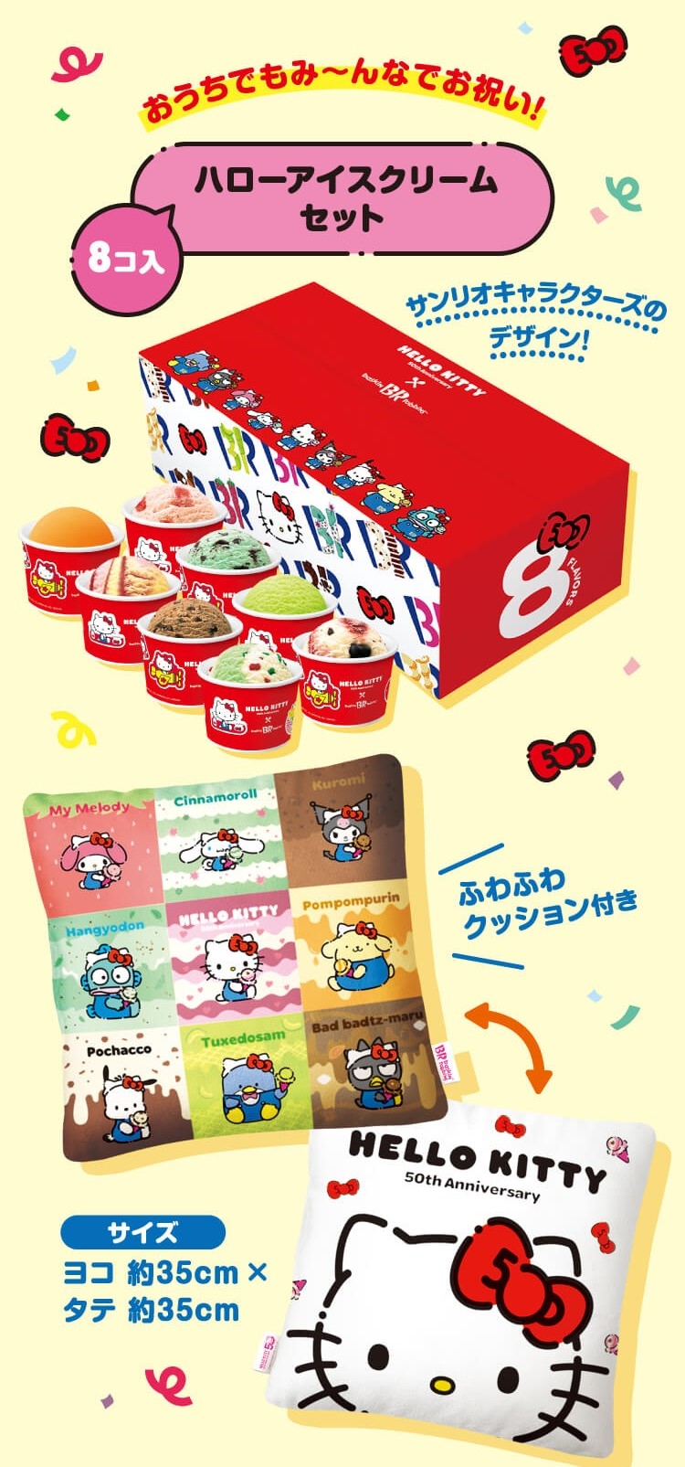 和之前一樣,這次也有推出套裝組合喔~挑選8款冰淇淋,裝在特別Hello Kitty款式杯裝與紙盒中,購買一組就會送Hello KittyX31冰淇淋50周年限定抱枕!一面是Hello Kitty滿滿的大臉,一面是三麗鷗角色們冰淇淋樣式圖案,可愛爆表又柔軟的周邊怎麼能不收藏!
