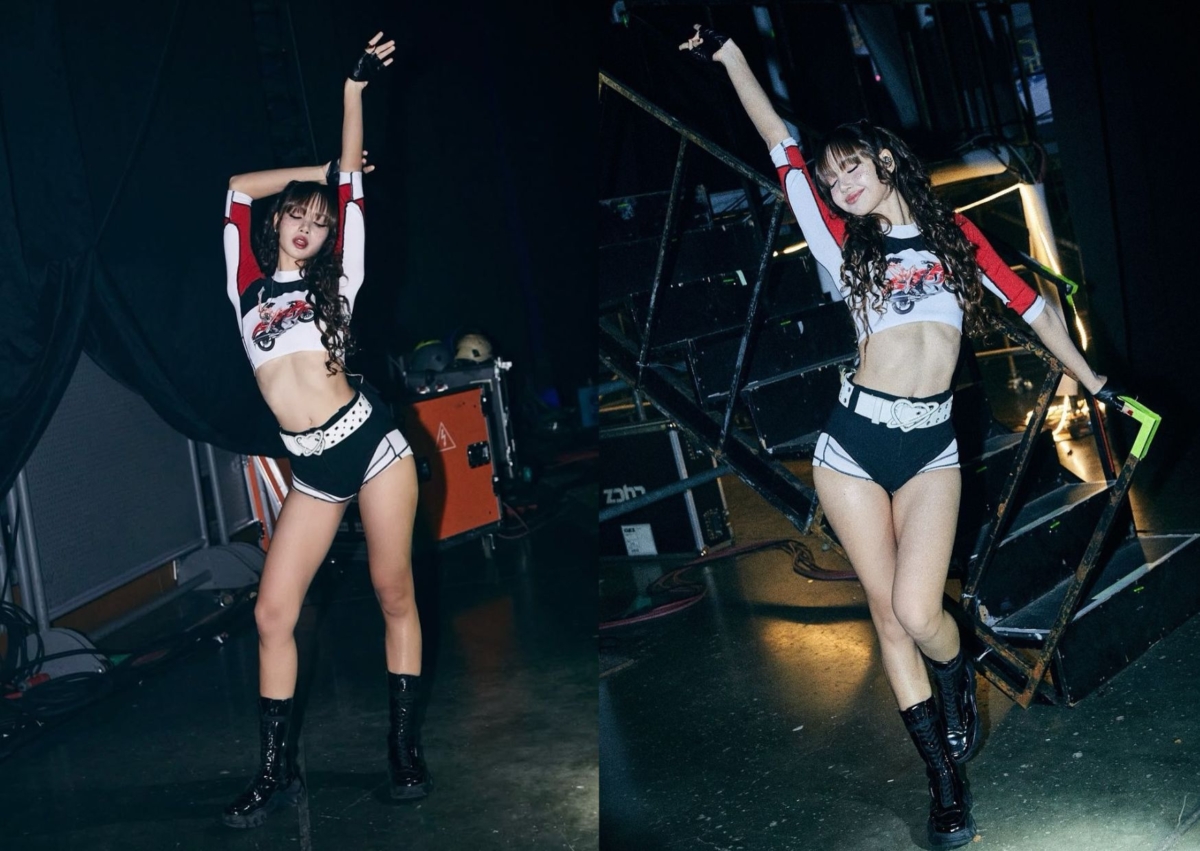 睽違多年,Lisa 終於以個人身份再訪台灣啦,換上一身全新演出服現身高雄巨蛋開唱,身穿黑紅白配色的貼身短版 T-Shirt,胸前還印有 Rockstar 機車圖樣,下身搭配超短褲,腳踩黑色中筒靴,戴上黑手套化身成賽車辣妹,火辣秀出螞蟻腰、屁股蛋和性感大長腿,不同的是頭髮弄成泡麵捲亮相,稍微綁起俏皮又動感!