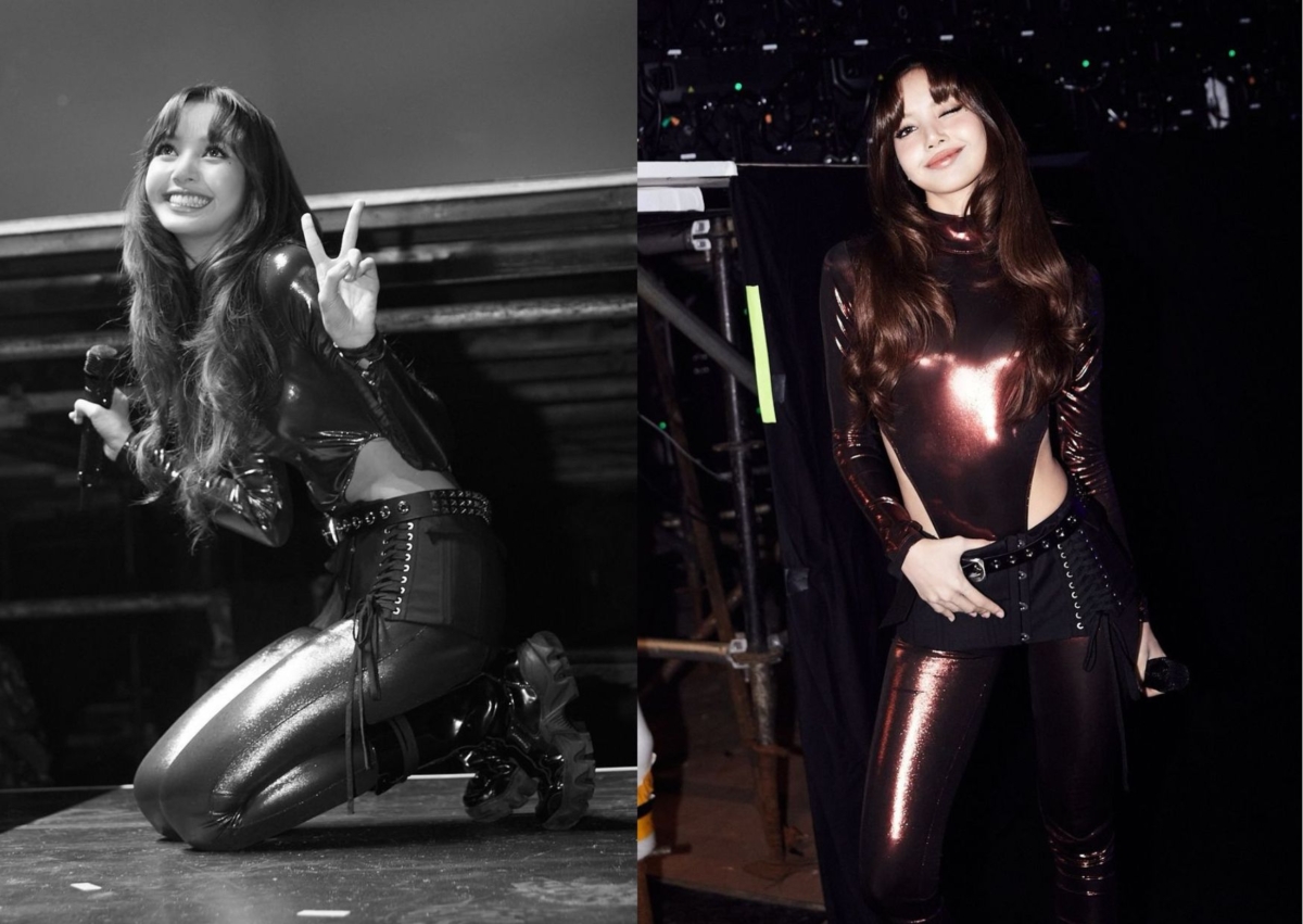 香港是 Lisa 這次亞洲巡迴見面會的壓軸站,以人氣歌曲《LALISA》開場,穿上黑色短版兩截式套裝,胸前以性感綁帶交錯,布料上飾有水鑽細節,搭配灰色花卉絲襪、毛毛長靴,綁起俐落高馬尾,妝容也顯得搶眼許多,呈現霸氣女王風範。