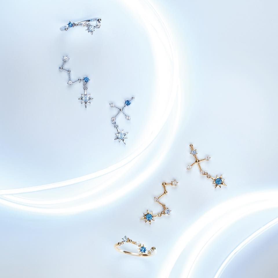 CONSTELLATION 系列以夜空中閃耀的星座為靈感,透過華麗鑲嵌設計展現出星座的光輝,細節處處精雕細琢,耳骨夾與尾戒以北方夜空中閃耀的仙后座為靈感,透過鑲嵌的鑽石展現出星座的光彩,設計充滿了工藝之美;同款手鍊與尾戒則結合了白色與藍色系的拓帕石,綻放令人沉醉的光輝,讓懸掛於夜空的星座成為觸手可及的存在。