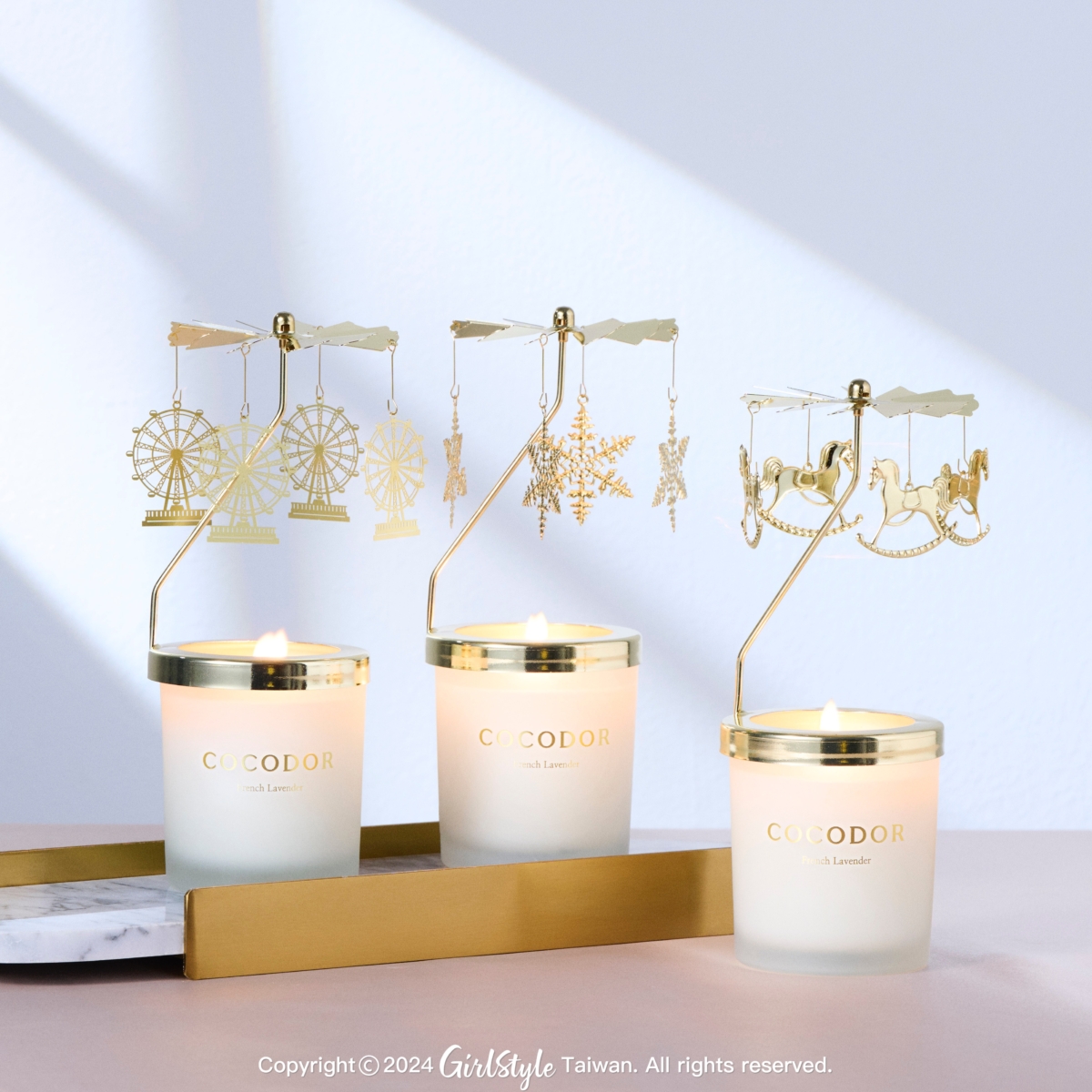 再來這款「大豆蠟燭+旋轉燭罩」的組合不僅香氣誘人,佈置效果更是滿分!不僅蠟燭本身的香氣讓人放鬆,最酷的是這個燭罩!當你點燃蠟燭,輕輕一推,燭罩上的雪花、摩天輪或是旋轉木馬就會隨著逐漸上升的熱氣流緩緩轉動,完全不需要插電,簡直是視覺與嗅覺的雙重享受!