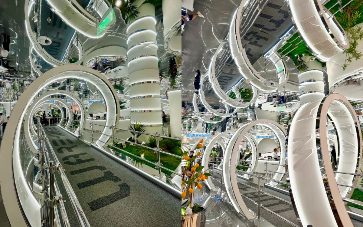 雖然每間連鎖店會有屬於自己的科技風格裝潢,但都採用了「鏡面天花板」的方式設計,產生向上延伸的視覺感,讓客人感覺像是踏入賽博龐克的世界中,超級震撼!