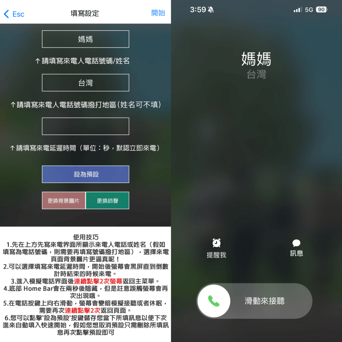 模擬來電最萬用!不管是在尷尬、不舒服、無聊等等的場合,甚至是路上遇到死纏爛打的推銷,都可以利用模擬來電來結束一切!在設定中隨意填寫來電者名稱與撥打地區、手機號碼,接著點擊開始,螢幕就會顯示你所設定的來店及鈴聲,這時你就可以假裝接聽,假借來電人的緊急狀況離開現場。想要真實一點的話,可以設定電話多久後會響,填寫的數字以秒計算倒數喔。
