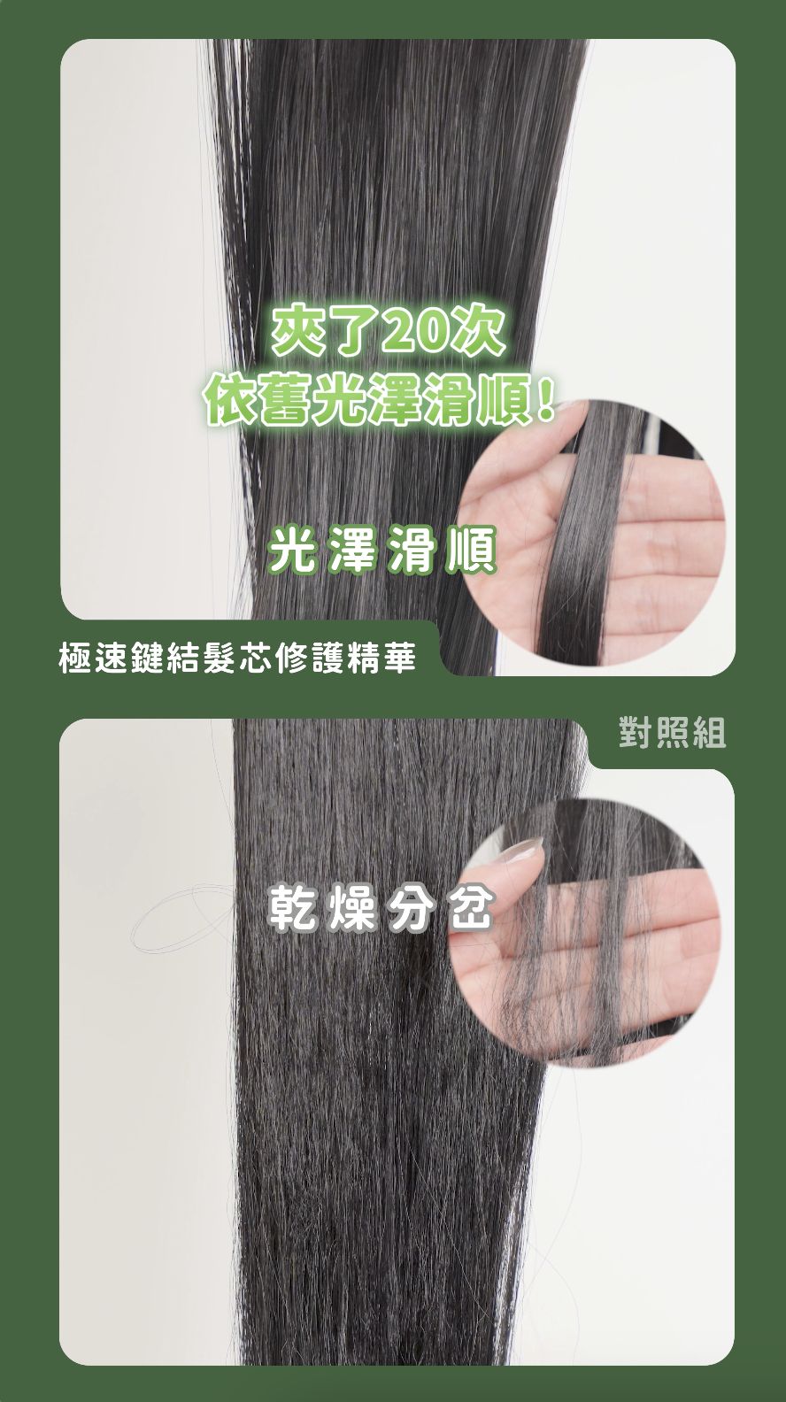 將「極速鍵結髮芯修護精華」和對照組放在一起,直接吹乾後用梳子整理,發現「極速鍵結髮芯修護精華」輕輕一梳直接到底,髮絲光澤度也超高,另一組吹乾後就接近髮梢位置就直接糾結在一起啦!「極速鍵結髮芯修護精華」不是隨口說的是經過科學實測認證,它是使用與頭髮角蛋白相似的植物性分子胜肽,分子大小可以深入滲透到髮芯深處,不單單只是毛鱗片或髮芯的潤澤包覆,第一個實測就超有感,更驚豔的還在後面!