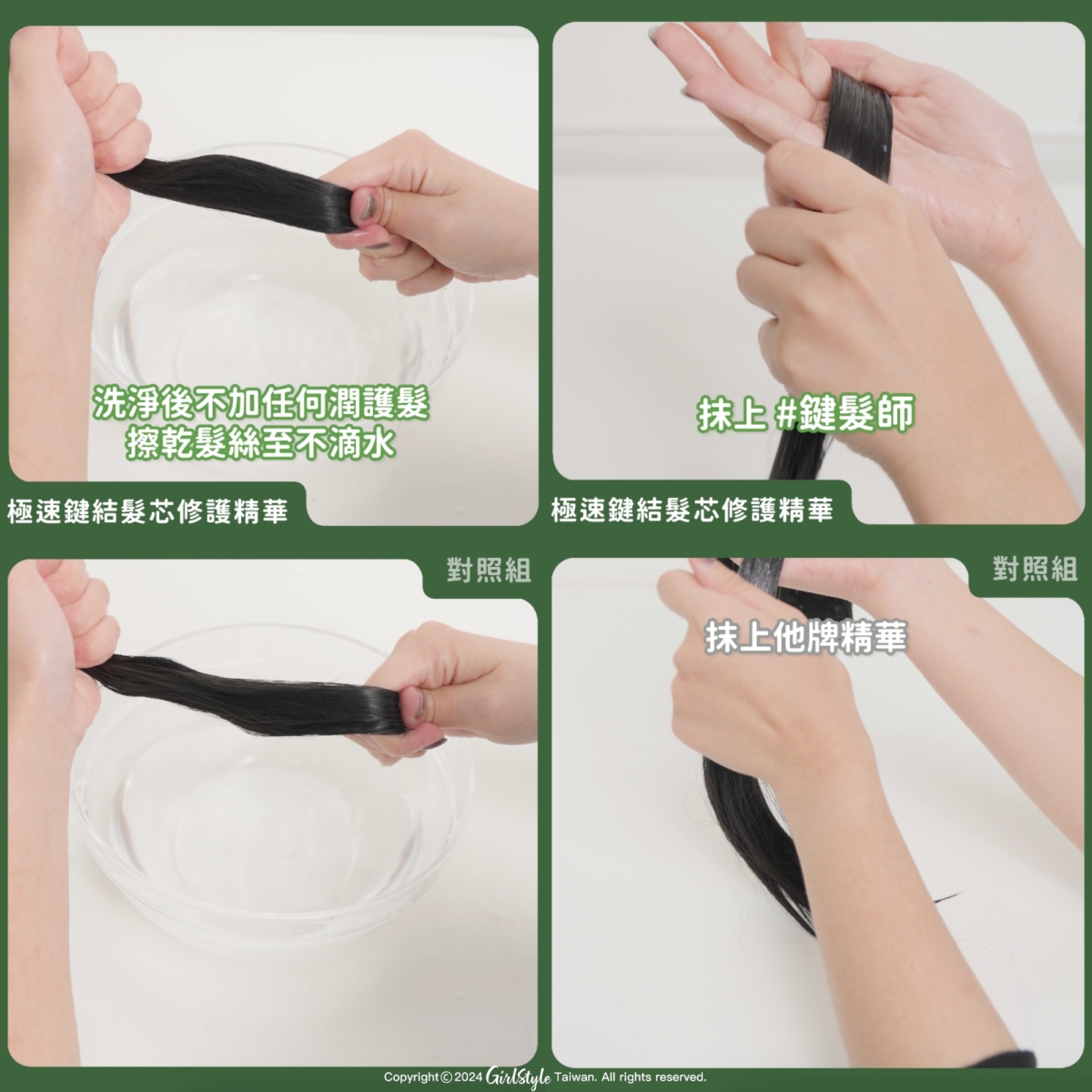 「極速鍵結髮芯修護精華」就像在髮絲上建構一層防護罩,髮絲以肉眼看完全沒有受損情況,反而對照組大概進人到一半時就已經感受到髮絲默默分岔亂翹了!「極速鍵結髮芯修護精華」透過和頭髮角蛋白相似結構的分子胜肽,均勻滲透髮芯後,重新建構角蛋白鏈,由內至外重建頭髮結構,即使有熱力、環境因素,也都能進行修護、提供防護,讓髮絲持續維持健康有活力!