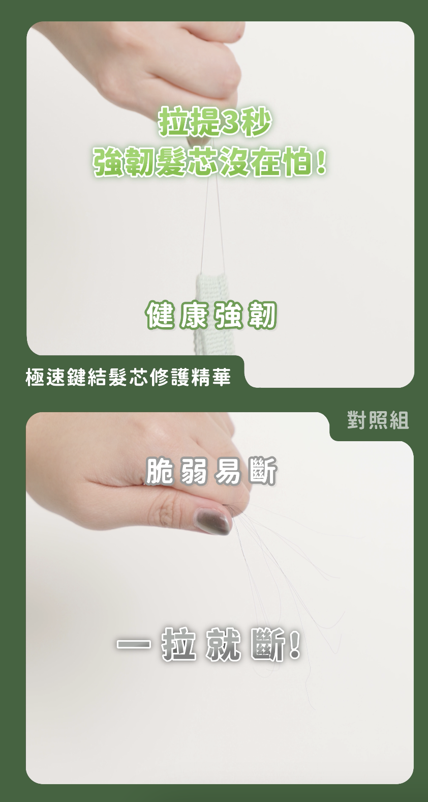 結果非常驚人~對照組一提就斷了,但「極速鍵結髮芯修護精華」超強韌拉提完全沒有問題,重新鍵結髮芯內斷裂的蛋白質束,就是由內部重新建構頭髮變得健康強韌,針對受損易斷裂的髮質來說真是一大福音!